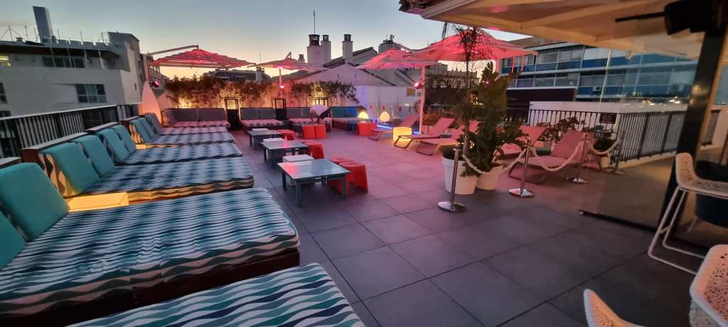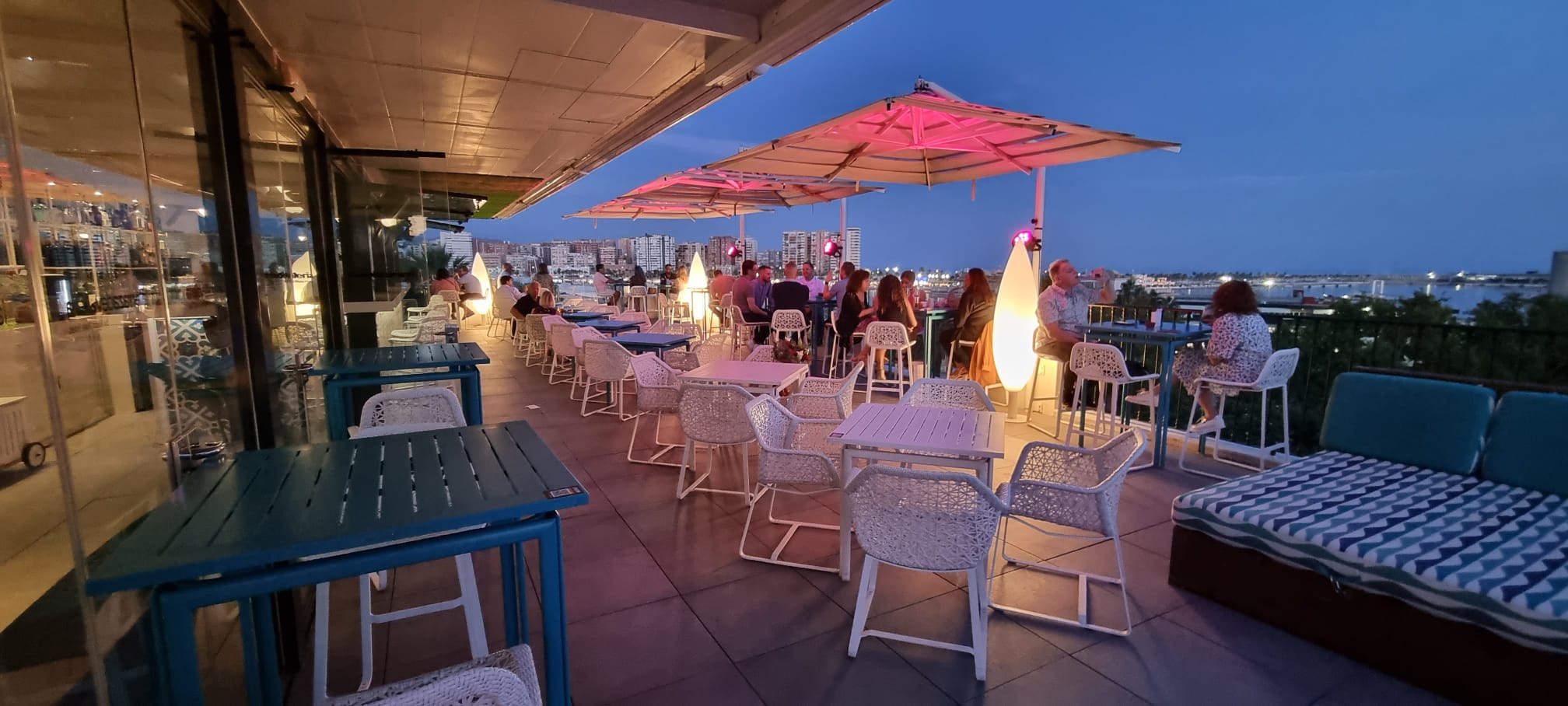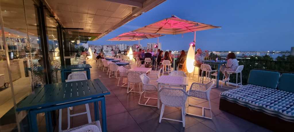 Op de vijfde verdieping van dit hotel zit een leuk hip dakterras waar je zo over de haven en een stukje stad uitkijkt.