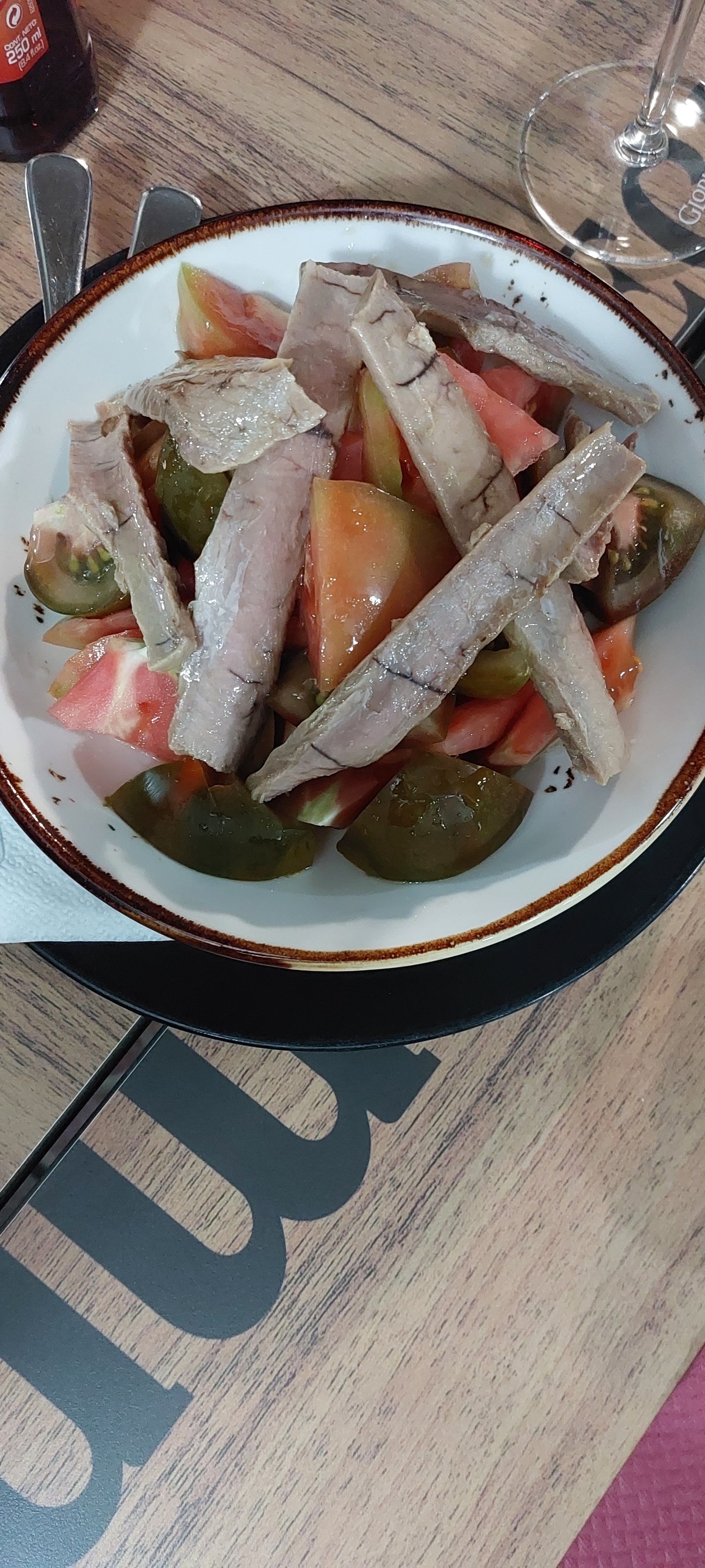 Zo gezegd zo gedaan we bestelden eerst een tonijn tomaten salade en vroegen of het volgende gerecht na ongeveer een half uur pas gereserveerd kon worden. Pap nam de hamburger en mam en ik de gamba’s pilpil.