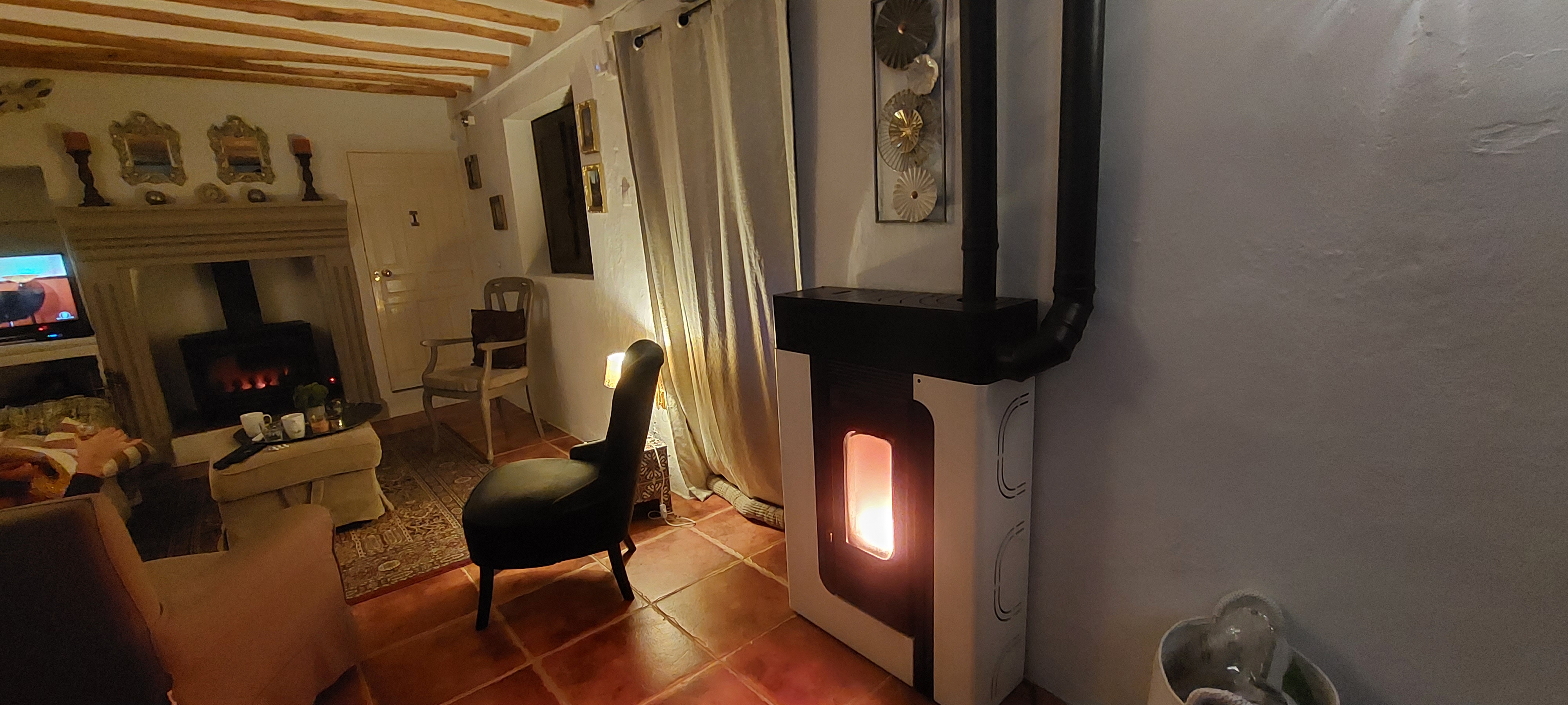 Toen we bij ons huis aankwamen zette Les direct de twee pelletkachels aan, één in de keuken en één in de huiskamer en ook nog de openhaard in de huiskamer om snel de warmte in de stenen te laten komen en binnen 2 uur was het gelukkig 18 graden binnen.