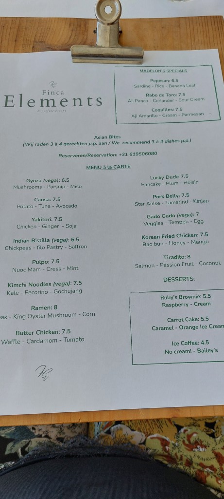 Ik had gereserveerd bij Finca Elements. De mensen die deze b&b runnen hebben ooit meegedaan aan een uitzending van Ik vertrek. Het grappige is dat eigenaar Marc eerst zelf als programmamaker gewerkt heeft bij Ik vertrek en nu zelf de sprong gemaakt heeft en alle valkuilen en troubels ook zelf ervaren heeft inmiddels. Ik heb toendertijd de uitzending wel gezien en wist eigenlijk helemaal niet dat ze ook van plan waren er een restaurant bij te openen.