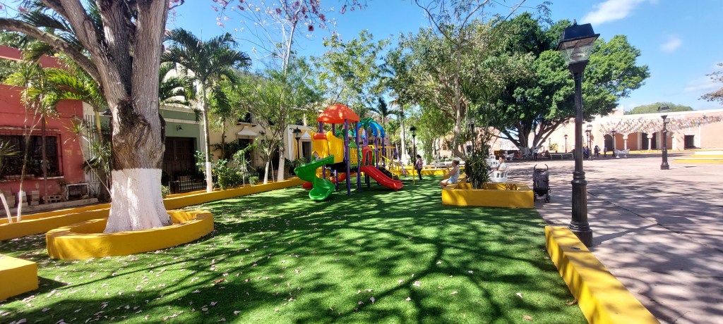 We hadden Fallon beloofd nog een speeltuintje te bezoeken in Valladolid, gisteren toen we de burrito’s gingen halen zagen we namelijk een allerschatigst pleintje waar ook een speeltuintje aan lag.