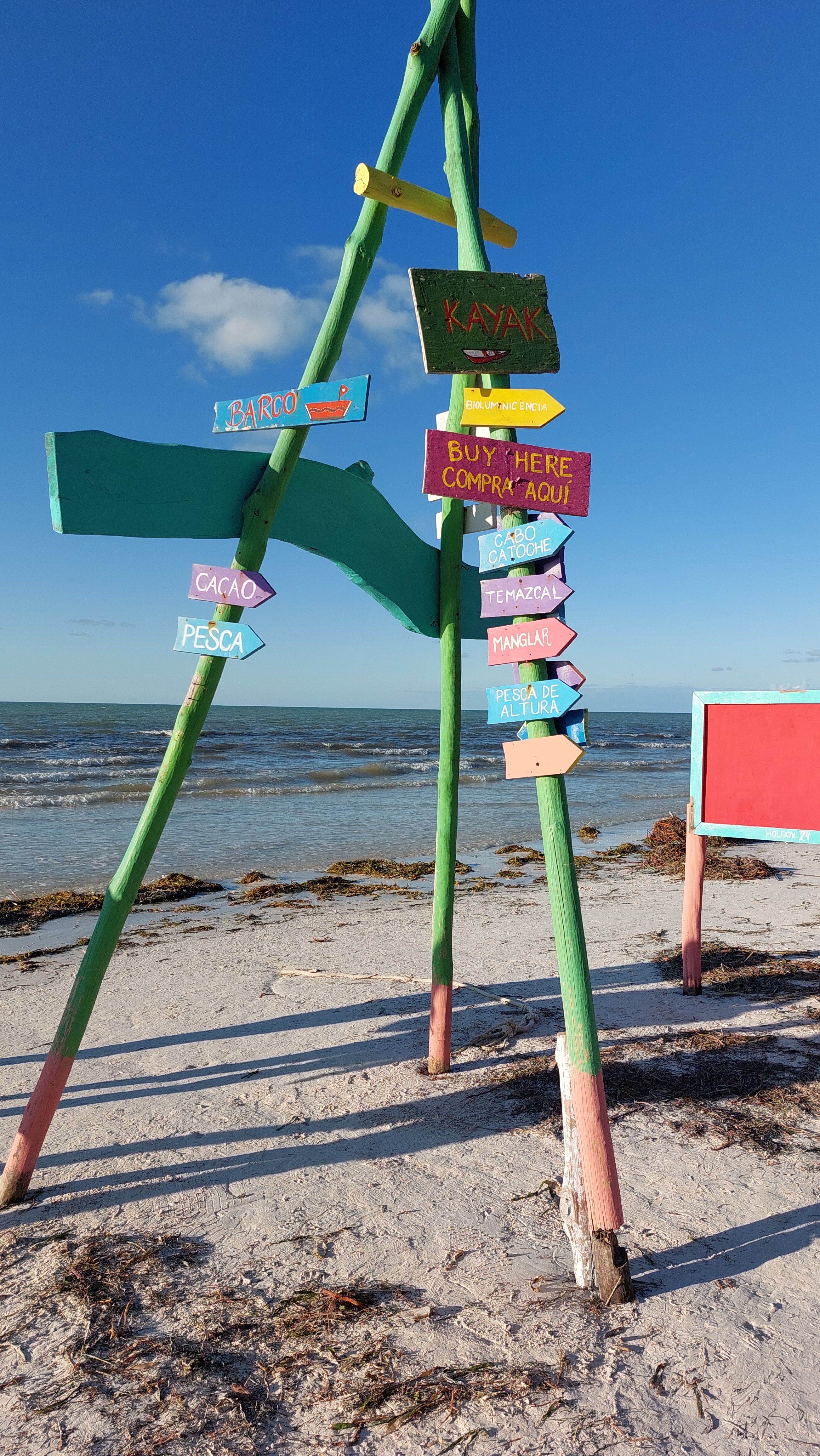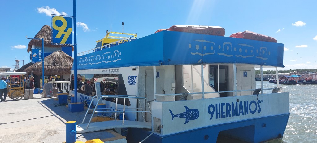 Bij de ferry staan er allemaal mannen om je te overhalen bij hun te parkeren. We reden zo dicht mogelijk bij de boot en daar besloten we dat het eigenlijk niet handig is om de koffers mee te nemen omdat Holbox geen geasfalteerde wegen heeft. Dus ter plekke pakten we een tasje in voor 3 dagen. Dat hadden we natuurlijk eerder moeten bedenken maar daar hadden we niet aan gedacht. Natuurlijk vergeet je dan wat, bv skip bo en yatzee.