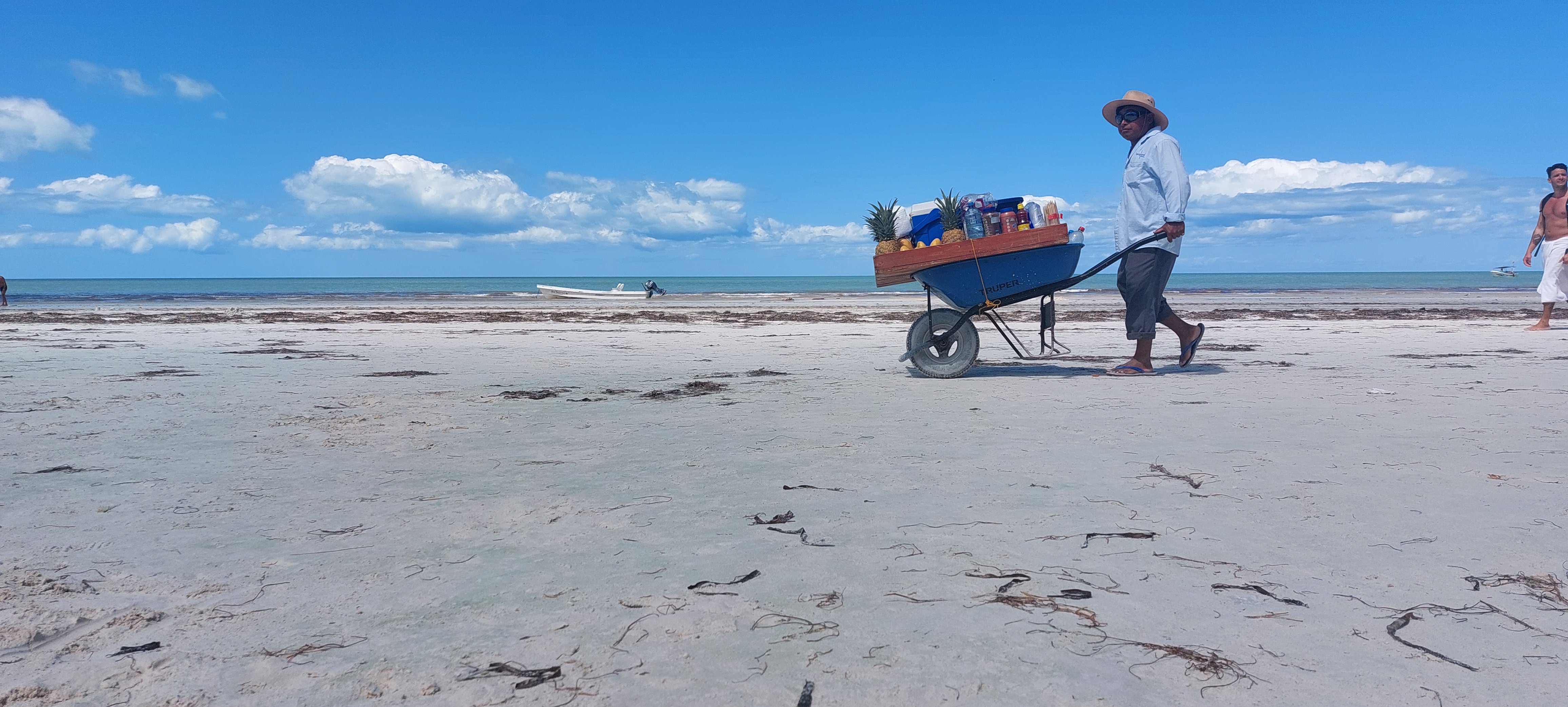 Er lopen verkopers op het strand die fruit verkopen, maar wij gingen wat drinken bij een strandtent en even bijkomen van de reis. Het was gelukkig niet zo warm vandaag.