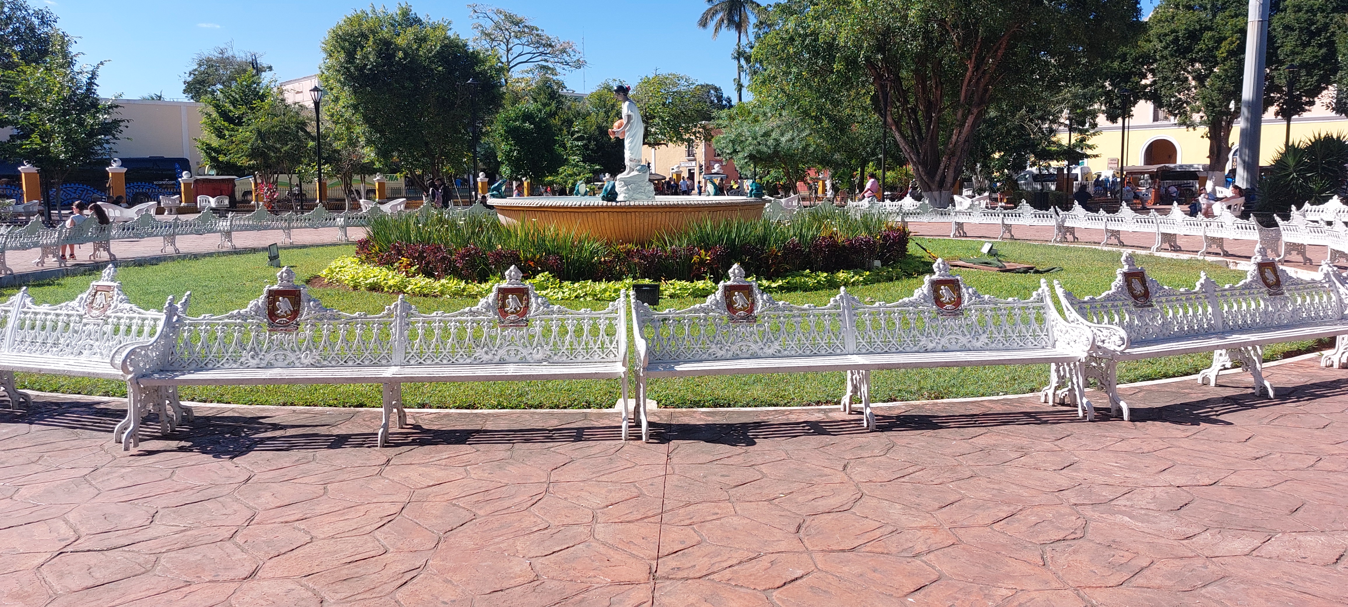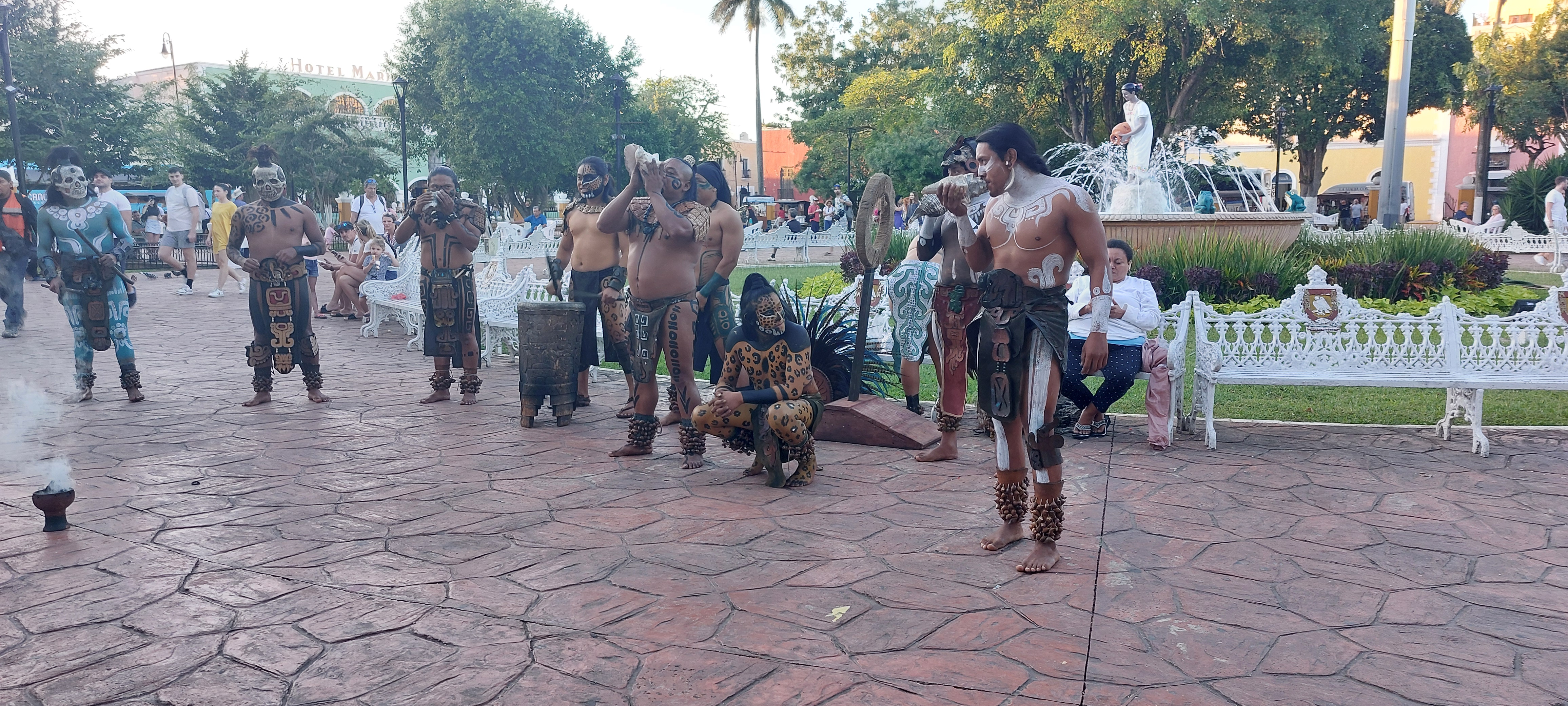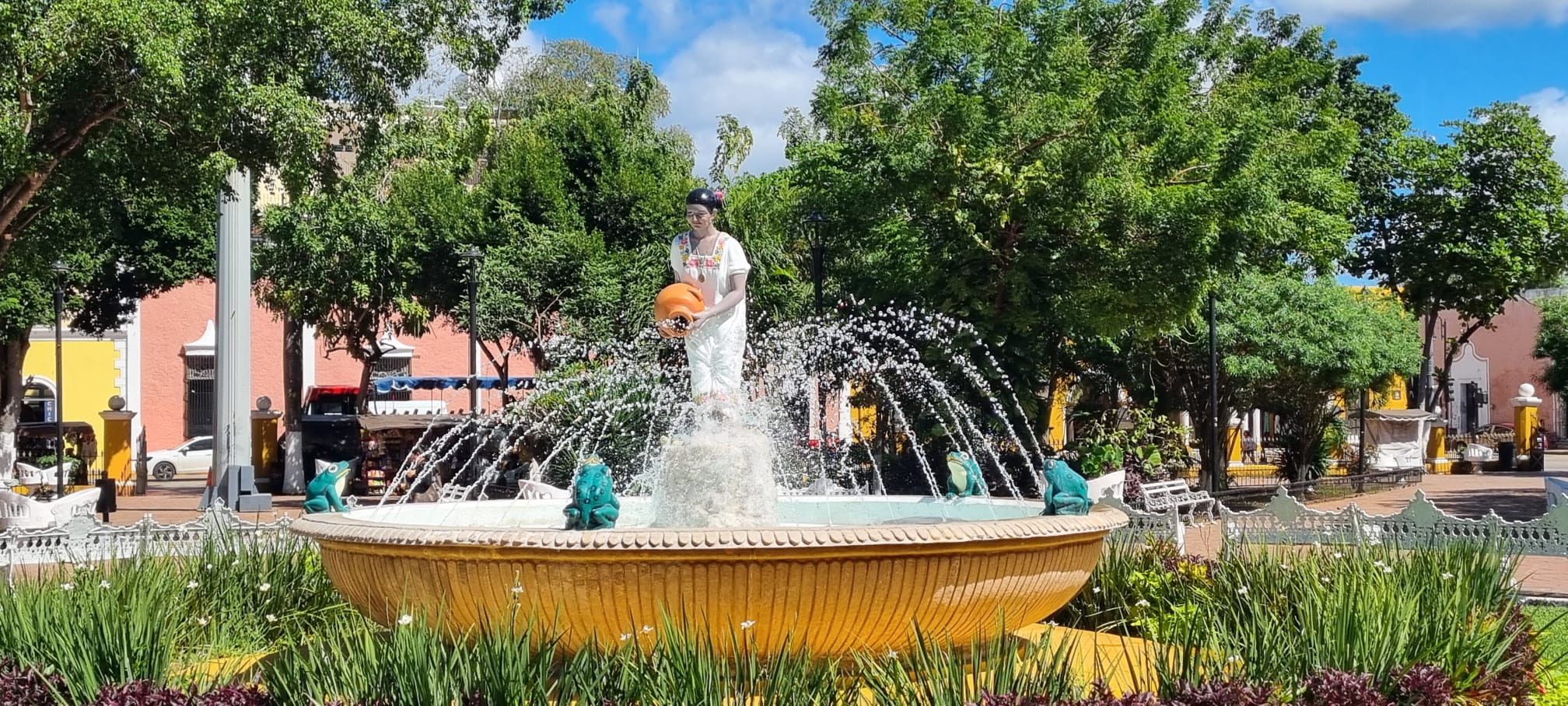 In het midden van het plein is er een fontein met een Maya vrouw.