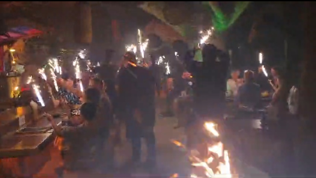 Ineens begonnen ze te klappen, licht ging uit, er kwam rook uit de rookmachine in kleuren en iedereen kreeg vuurwerk in zijn handen en er werd gezellige meezing muziek gedraaid. Sweet Caroline.