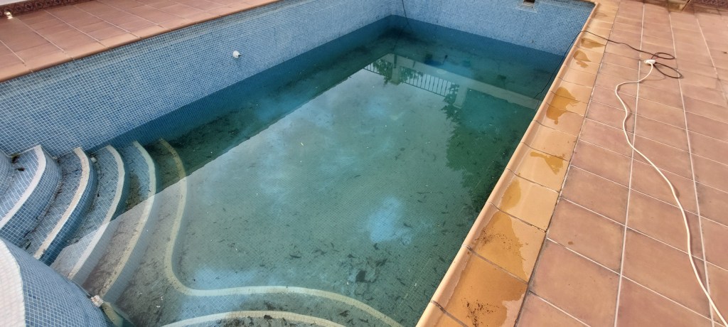 Ik heb me vandaag bezig gehouden met het schoon boenen van het zwembad, dat zal ik later nog een keer gaan doen. Lesley is de losse tegeltjes gaan uitkrabben om er vervolgens weer nieuwe in te gaan plakken.