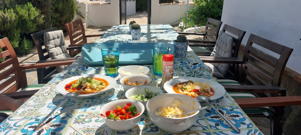 Ondanks dat we 2 jaar geleden alle losse tegeltjes hebben laten vervangen en alle lege voegjes bij hebben laten vullen, waren er nu toch een aantal tegeltjes weer los en een paar voegjes moeten ook weer bijgevuld. De komende dagen zal Lesley daar zoet mee zijn. Tussen de middag had ik een echte Spaanse soep klaar staan, gazpacho, heel gezond met allerlei groenten erin.