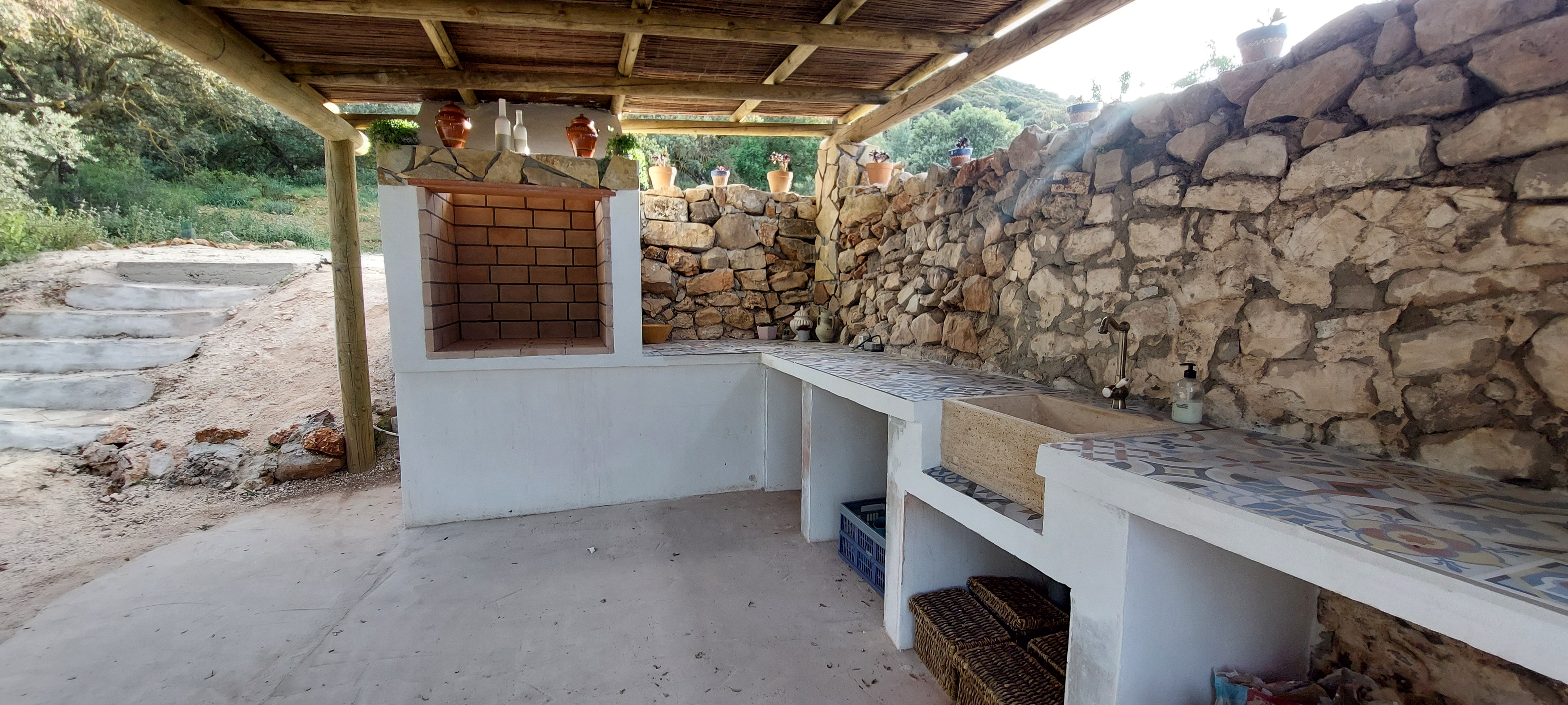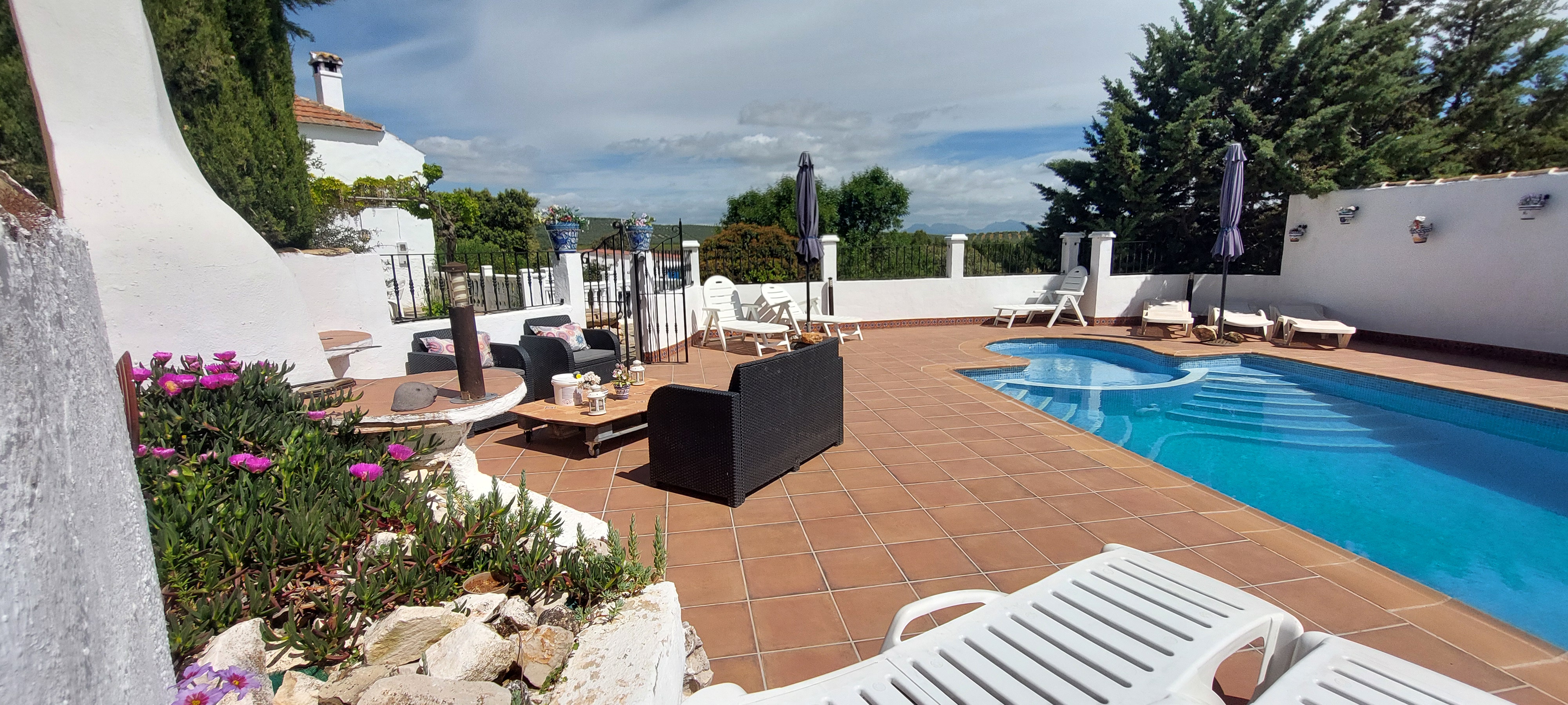 Om 1 uur waren we uitgenodigd door onze Belgische vrienden Tatienne en Joost om bij hen te komen lunchen. Zij runnen op 10 minuten bij ons vandaan een prachtige b&b Casa Valle de Oro. Er waren ook nog andere vrienden van hen, Ann en Guy. Voor het eten bewonderden we eerst hun net nieuw aangelegde zwembadterras, het is echt prachtig geworden.