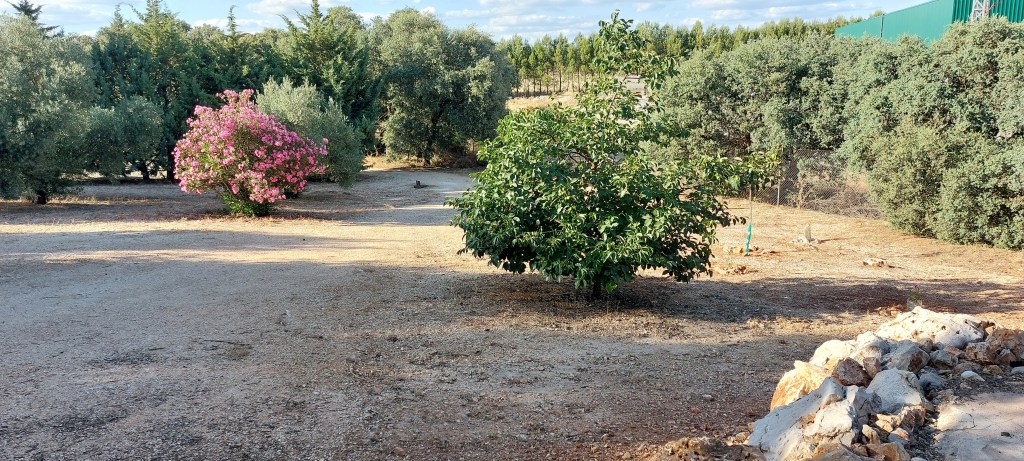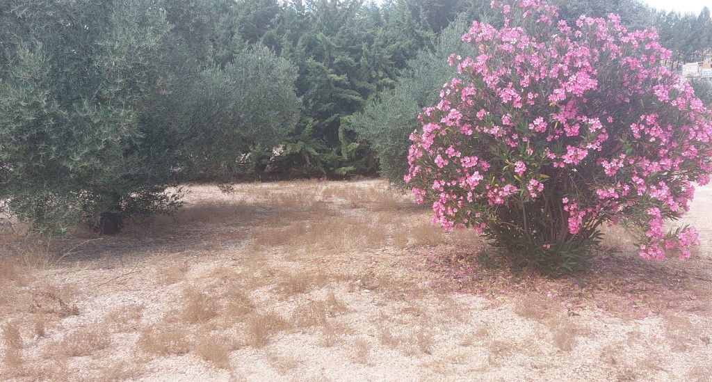 Na een kopje thee en koffie en een klein broodje ging ik verder met het onkruid verwijderen op de open plek. In het voorjaar hebben we daar wat oleanders, valse peperbomen en een olijfboompje geplant en gelukkig doet alles het nog. Mede door de goede zorg van mijn moeder die ze flink water heeft gegeven om ze zo te laten wortelen.