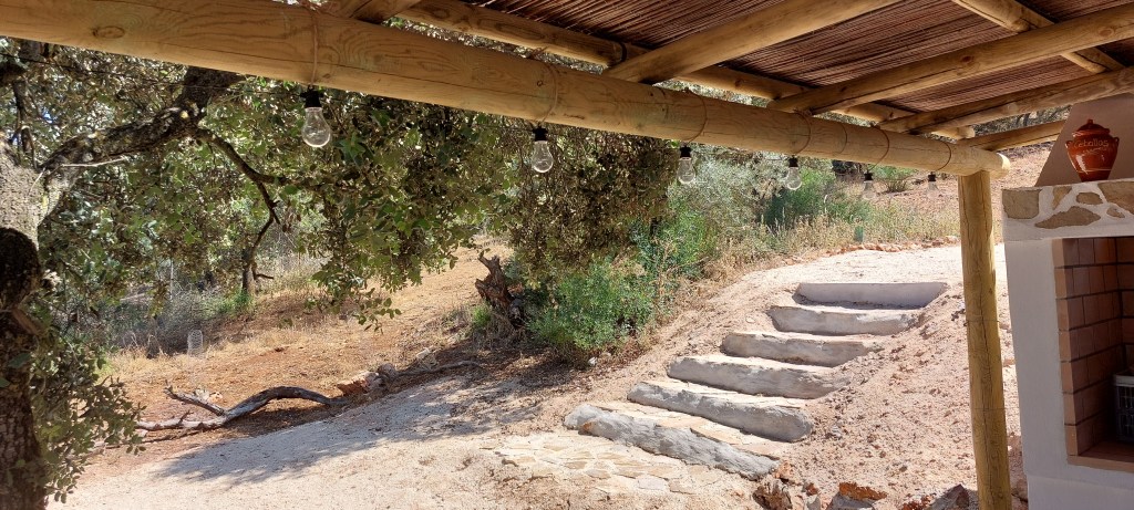 Wel hebben we lampjes opgehangen maar de grote lamp in het midden kan pas als de electra in orde gemaakt wordt. Houten plankjes moeten we ook nog kopen en een grill voor de bbq natuurlijk. Dus klaar is het voorlopig nog niet maar er komt schot in.