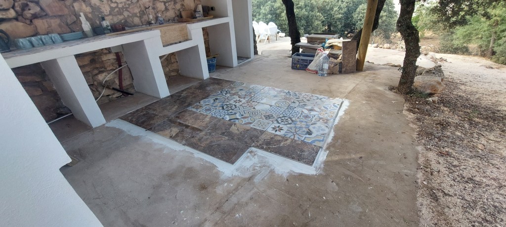 Voor Lesley was het echter een ideale dag want hij is begonnen met tegelen en dan kan het beter maar niet al te warm zijn. Eerst even meten en kijken hoe de tegels moeten komen te liggen en dat valt niet mee want niks loopt recht. Wat het ook moeilijker maakt is het tapijtje van andere tegels die ik graag in het midden heb omdat ik dat zo mooi vind staan en we die tegels toch over hebben.