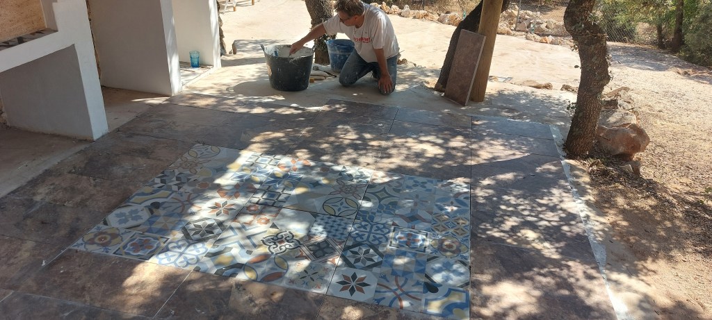 Lesley ging verder met het tegelen, weer 1 zak lijm gedaan vandaag. We hadden er 5 maar we gaan er toch nog 1 bij kopen voor de zekerheid. Het ziet er al mooi uit alhoewel je het op de foto door de zon niet zo goed ziet.