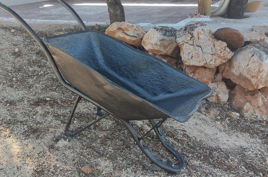 Mijn projectje was de oude kruiwagen zonder wiel onder handen te nemen. Ik dacht dat het wel leuk zou zijn deze te verven en dan bij de buitenkeuken te zetten en daar dan de bbq tangen in te leggen.
