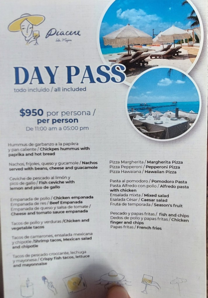 Je kan er een dagpas kopen en dan mag je de hele dag aan het strand zitten voor ongeveer 45 euro en onbeperkt eten en drinken, ook cocktails, dat is echt een geweldige deal.