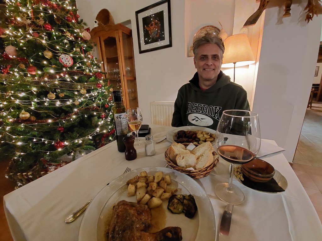 Ik had de kerstboom uit de mottenballen gehaald en de pelletkachel aangedaan omdat we hier geen centrale verwarming hebben natuurlijk. Knus hoor zo in ons huisje, ik vind elk jaargetijde wel iets hebben hier bij ons huis. December is zo lekker omdat het overdag zalig rond de 18 graden is maar savonds is het koud en zit je knus voor het vuurtje. Om half 9 reden we 3 km bij ons vandaan naar restaurante la Paloma en daar was het één en al kerst, wat een sfeertje, buiten was het pand prachtig versierd.