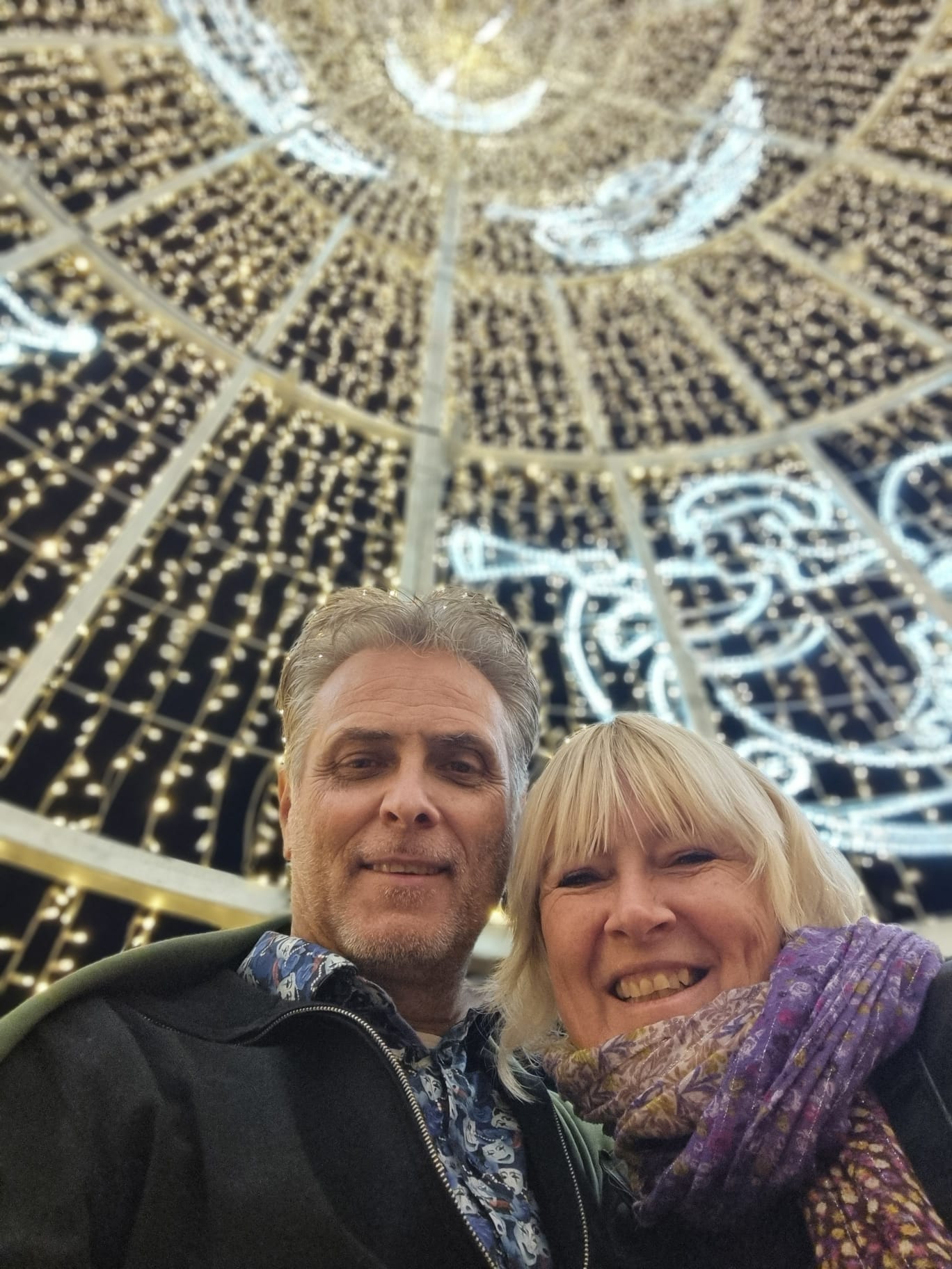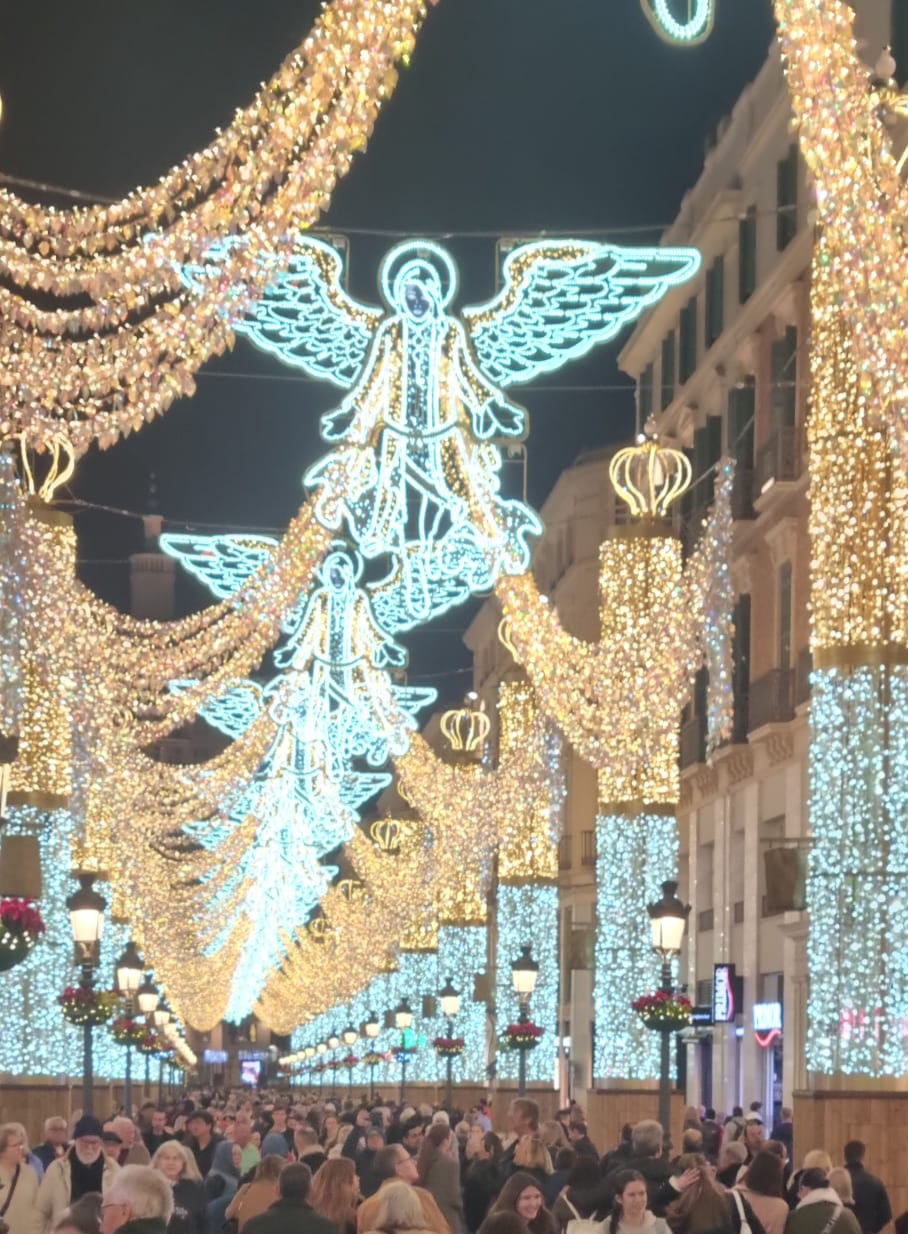 Daarna door naar Málaga centrum, inmiddels was het half 4 en hadden we nog steeds niks gegeten, snel kochten we even 2 broodjes en wat te drinken bij de 100 montaditos. Daarna liepen we lekker een rondje centrum. Om half 7 waren we in calle Larios waar de feestverlichting show op de muziek aan en uit ging en na 10 minuten helemaal aan bleef in volle glorie. Duizenden mensen waren van de partij om de engelen te zien, iedereen zong vrolijk mee en er werden vele foto’s gemaakt.