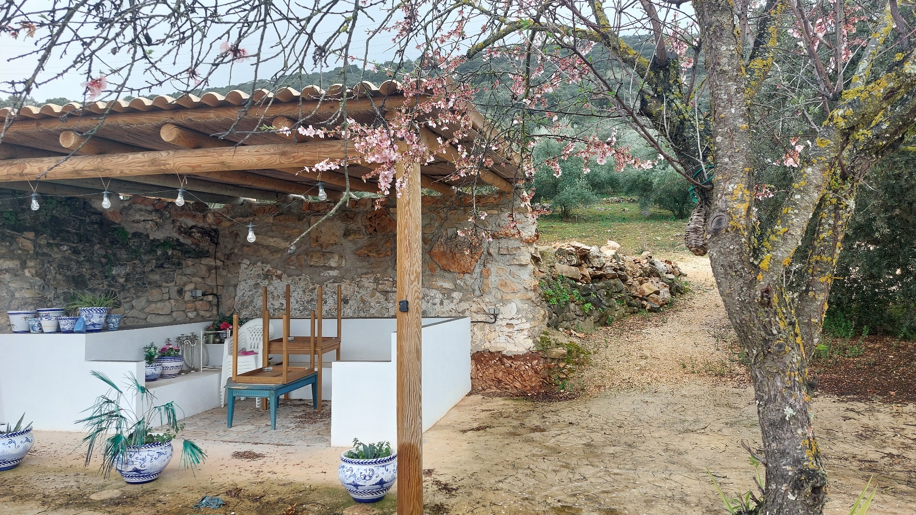We hebben tussen de buien door nog wel de plantjes buiten gezet, die stonden opgeslagen in het washok. De bloesem die nog in de amandel bomen zat is er inmiddels ook uitgespoeld.