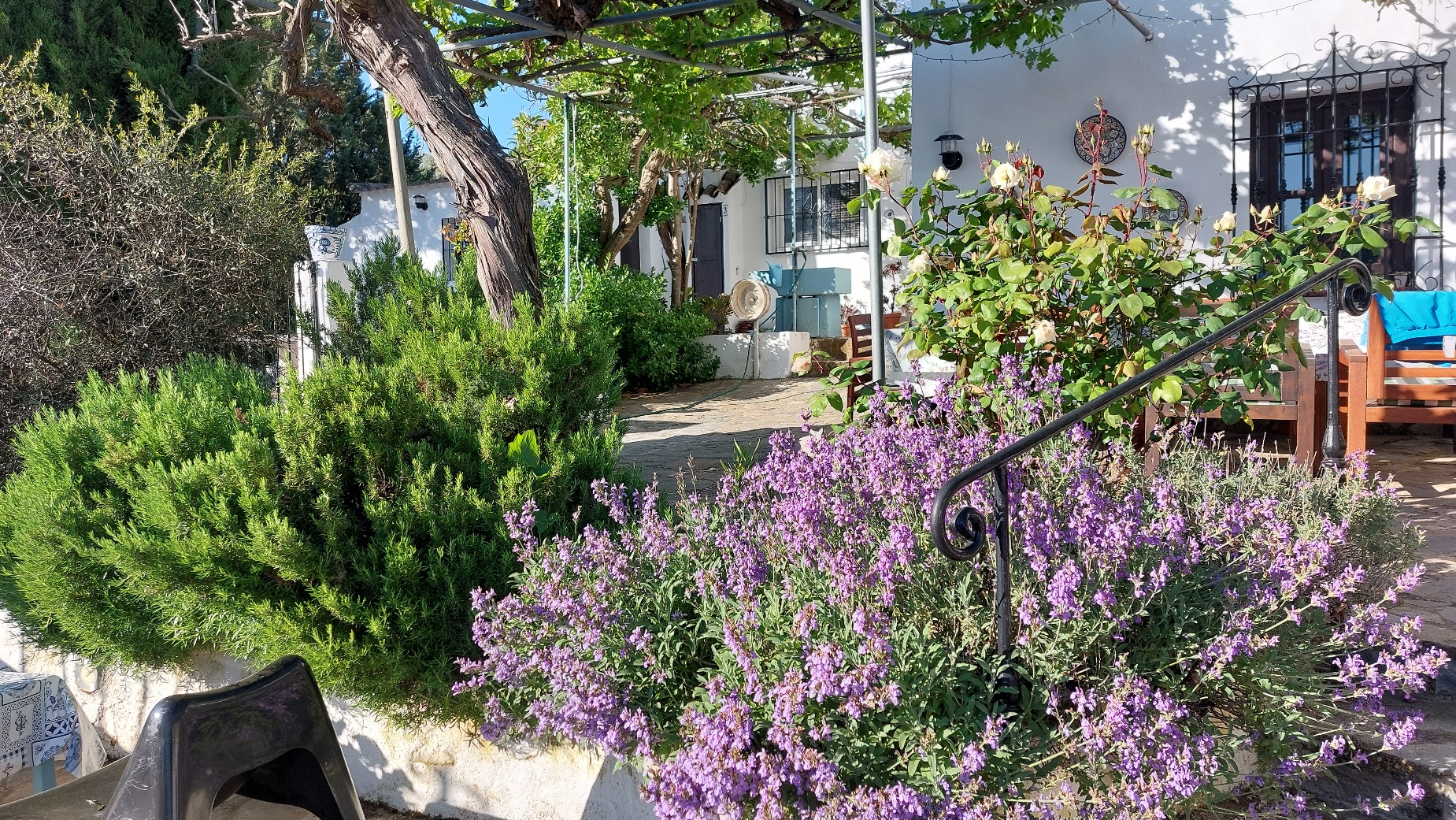 Toen we aankwamen op Hacienda la Suerte hadden mijn vader en moeder een lekkere lunch verzorgd. Ze waren er al 2 dagen. De blaadjes op het terras waren aangeveegd en bij het zwembad lagen de dekjes op de stoelen en stonden de parasols uitgeklapt. Dat was een leuke binnenkomst. De salie op het terras was mooi aan het bloeien. De wisteria was helaas net uitgebloeid.