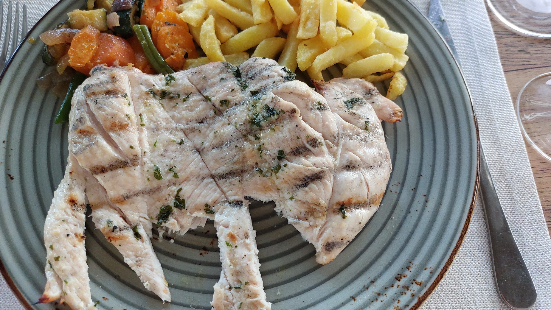 We hadden een middag vlucht en om half 7 landen we. De auto ophalen en gelijk door naar Manolo daar waar onze vakantie vaak echt begint. Zo vertrouwd en zo gezellig om hier weer te zijn. Je krijgt hier altijd lappen vlees, kijk mijn kipfilet lijkt na een paar happen op een kameel.