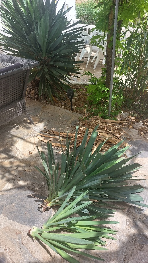 Maar ik begon eerst met de yucca op het terras om die een kopje kleiner te maken. Ik heb er wat stronken afgehaald maar je ziet het niet eens, hij is nog steeds vol. Deze nieuwe scheuten ga ik weer planten. Tevens heb ik wat dorre blaadjes van de planten in de potten afgehaald. Die staan er nu ook weer tip top bij.