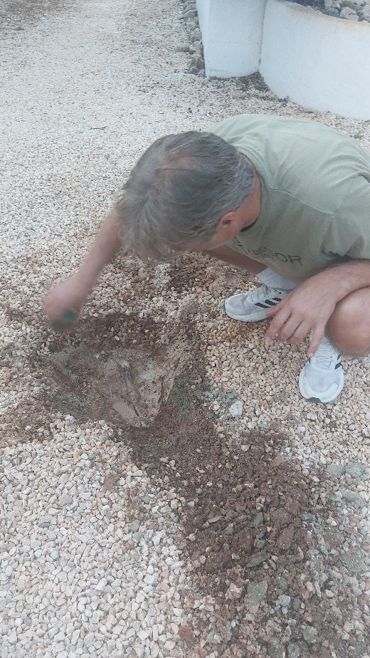 Toen ik ’s ochtends vroeg naar de studio liep zag ik ineens een hoop wespen zwermen over de grond. Nee, dacht ik gelijk want ik weet uit ervaring wat dat betekent. Een water lek. Ja hoor ik had gelijk er lag een plasje water in het grind dus we moeten weer aan de bak om in de grond te gaan graven op zoek naar de slang waar een gaatje in zit. De waterslangen lopen hier deels onder de grond deels boven de grond. Dit is al het zoveelste lek, grom, gezeik weer.