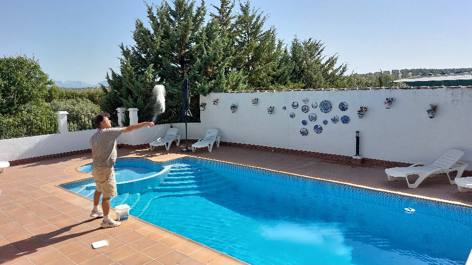 Het zwembad schoonmaken is ook een klus, eerst de blaadjes eruit (dagelijks), de bodem stofzuigen en chemicaliën erin(wekelijks of met warme dagen meerdere keren per week), het moet ook om de 4 dagen bijgevuld worden met vers water, omdat het water verdamd met zonnig weer. Soms laten er kleine tegeltjes los omdat de lijm oplost van al die chemicaliën die in het zwembad zitten, wat boven water ligt plak je weer vast, waar je niet bij kan moet gebeuren als het zwembad leeg is. Dweilen bij het zwembad moet ook regelmatig gebeuren, voor je het weet heeft er weer een zwaluwtje op de tegels gepoept na hun dagelijkse drink momenten uit het zwembad. De muurtjes rond het zwembad worden elke twee jaar geverfd. Net zoals de ander muurtjes en de balustrade.