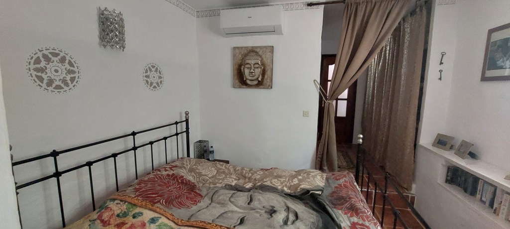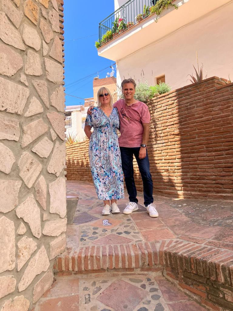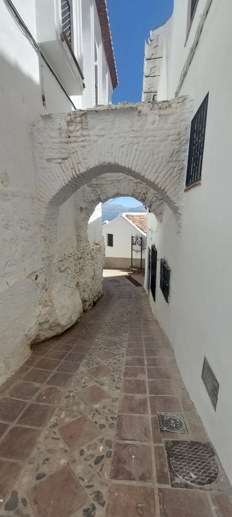 Vorig jaar hadden we heerlijk gegeten bij b&b Finca Elements en we wilden Elvira deze smaak ervaring ook laten beleven. De b&b die gerunt wordt mensen die ook gefilmd zijn door de ik vertrek filmploeg ligt tussen Colmenar en Riogarde in, het ligt ongeveer 50 minuten bij ons vandaan. Vlak daarbij vind je ook het plaatsje Comares en daar zijn we 15 jaar geleden een keer geweest en dat vonden we toen erg leuk. We besloten om het te combineren door vooraf aan het eten Comares weer een keer te bezoeken, het is het hoogst gelegen dorp van de Axarquia. Ik kon herinneren van 15 jaar terug dat we over kronkel weggetjes reden toentertijd maar dat het zo spannend was had ik niet onthouden. Misschien geblokt of misschien vond ik het toen niet zo eng maar nu beleefde ik angstige momenten. Ik reed zelf in het begin en dat stuk was te doen, maar het ging mis toen we in Colmenar kwamen. Ik denk dat we een afslag gemist hadden of zo want de Google maps stuurde ons door de smalle dorpsstraatjes en ineens zag ik een kronkelend pad omhoog dat zo stijl was dat je daar alleen in zijn 1 omhoog kon gaan. Ik was het zat, ik vond het te eng en stapte uit. Rijd jij maar verder Les zei ik. Ik vond het vooral eng omdat ik niet wist of we goed zaten en daardoor niet ineens op een nog smaller stuk uit kwamen en moesten gaan keren op een plek waar je eigenlijk niet kan keren, bang dat de handrem het niet goed doet ofzo of dat je net iets te ver doorijdt en zo de afgrond in stort. De rillingen liepen over mijn rug en ik zit dan echt werkelijk bijna te huilen zo bang ben ik dan. Ik ben daar niet trots op en vind het ook heel vervelend voor mijn medepassagiers maar ik kan mijn angst niet verbergen. We kwamen uiteindelijk, pff zweetdruppels weg vegend, bij het dorpje aan maar volgens mij zijn er echt betere wegen naar toe dan dat we nu gereden hebben, dit is vast de meest avontuurlijke, want het was zo smal dat er geen twee auto’s naast elkaar op een normale manier kunnen passeren, een afgrond zonder vangrails en stenen op de weg die van de rotsen gevallen waren.