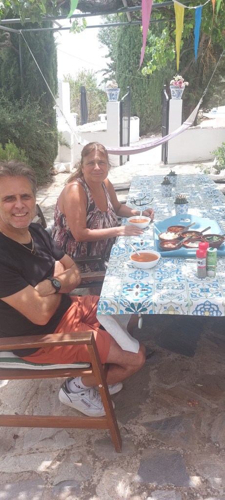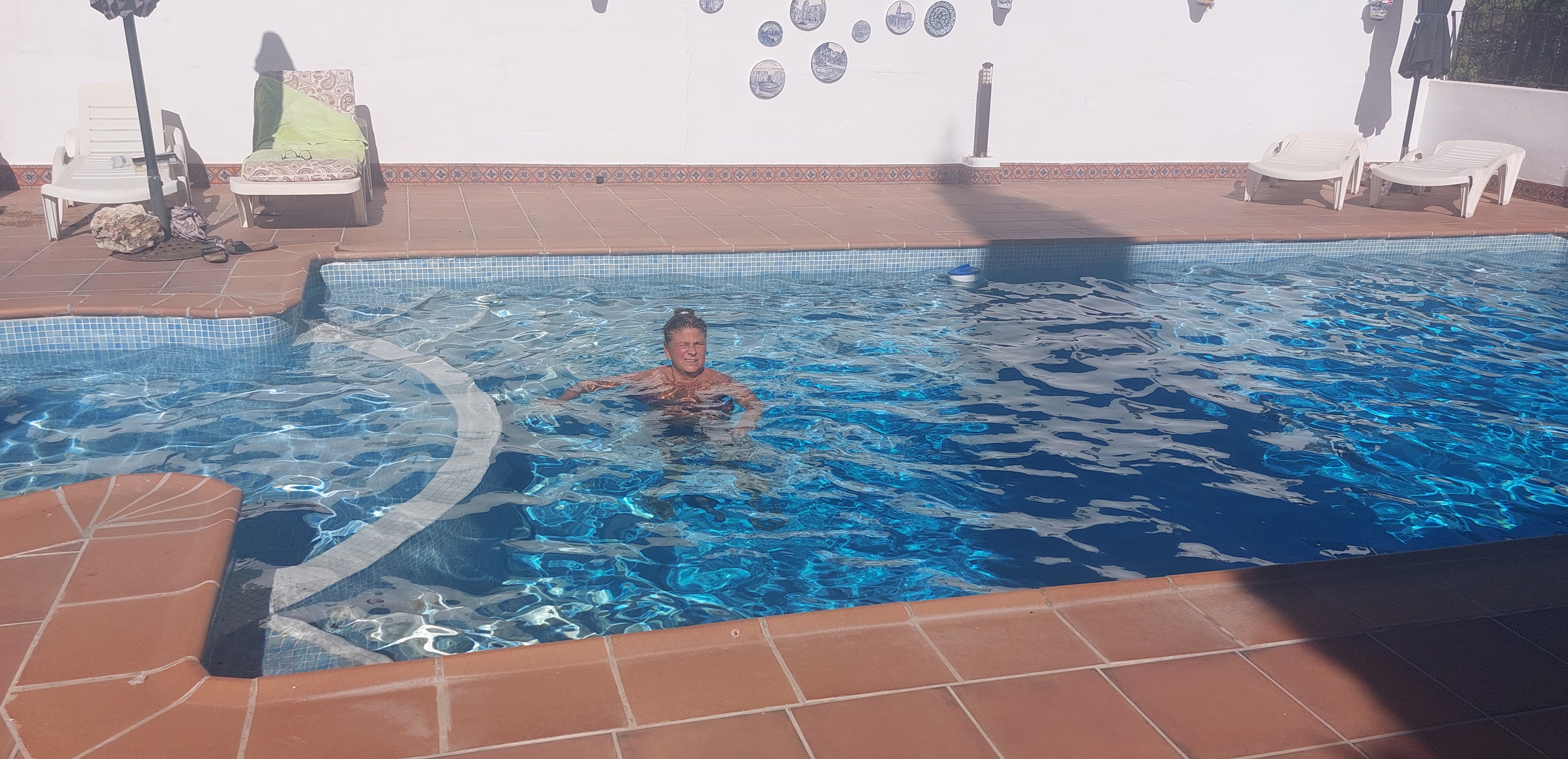 In Spanje, in Spanje, in Spanje, in Spanje schijnt altijd de zon. Een lekker meezingertje maar geloof er maar niks van hoor. Maarja het zingt niet lekker mee wanneer je dit moet zingen: In Spanje schijnt vaak maar niet altijd de zon. Sinds Elvira hier is is het namelijk geen mooi weer vorige week zat ik nog te klagen dat ik 34 nog zo warm vond maar nu is het zeker 12 graden kouder en geen zon maar dikke bewolking en af en toe een regenbuitje. Dat heb ik nog nooit meegemaakt zei Elvira dat ik niet bij het zwembad heb gelegen en niet gezwommen heb in juni als ik kom. Inmiddels is ze al sinds 2018 elk jaar rond Les zijn verjaardag een aantal dagen hier.