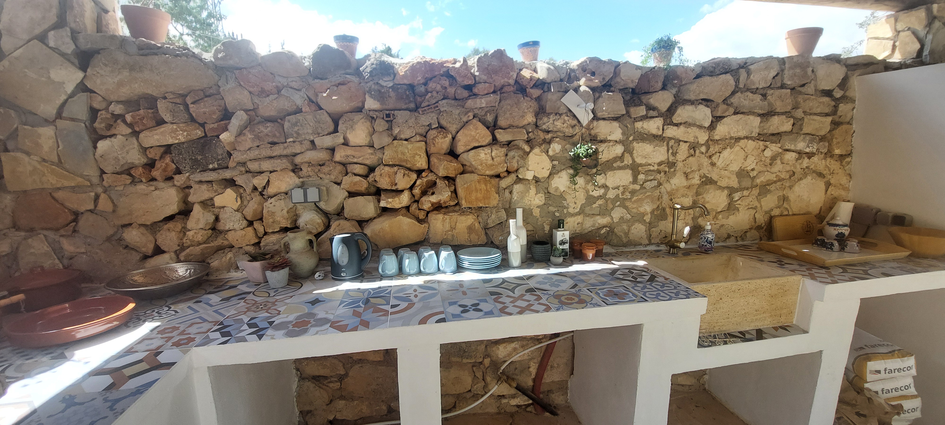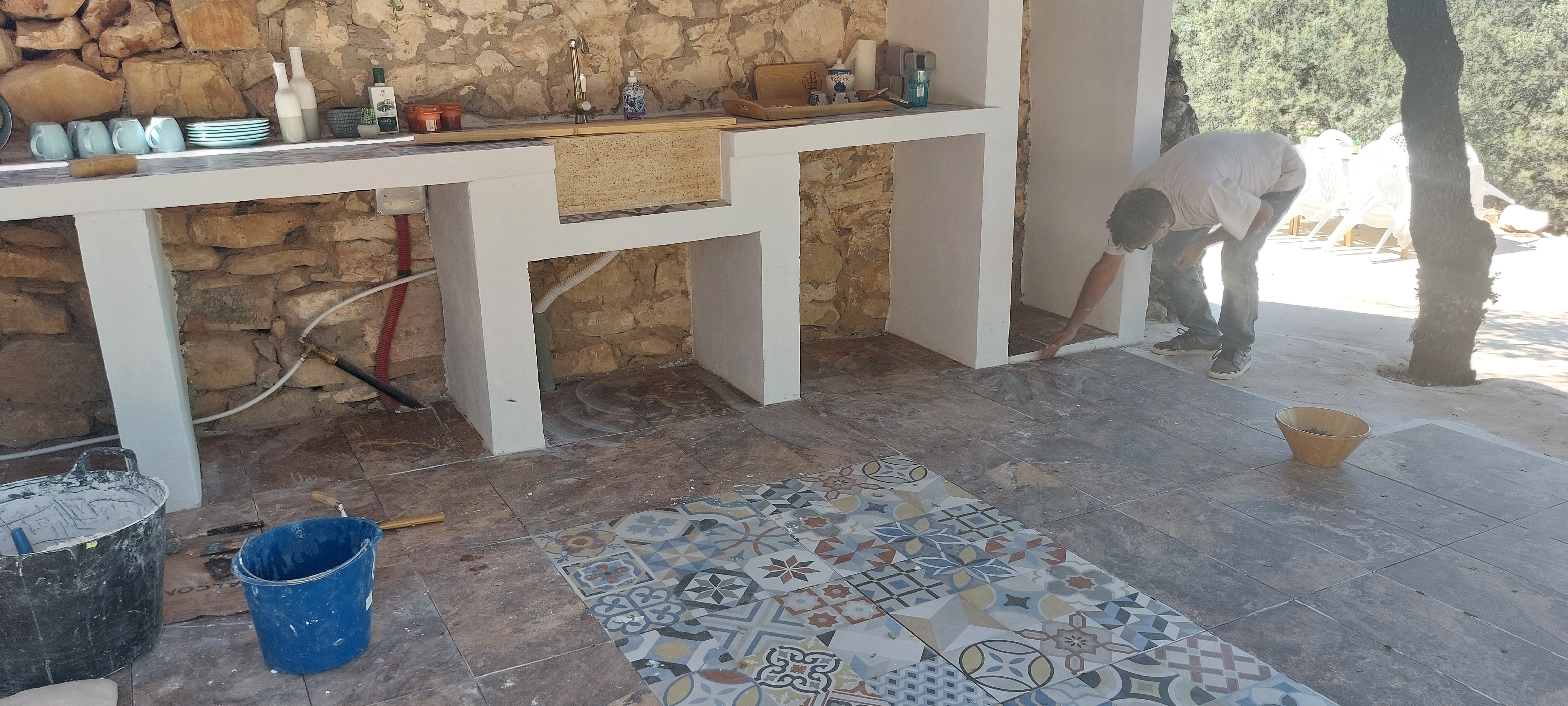 Paco kwam om de elektriciteit in de buitenkeuken in orde te maken en om de kraan aan te sluiten. Daarna heb ik het aanrechtblad nog een keer schoongemaakt en zo wordt het steeds mooier.