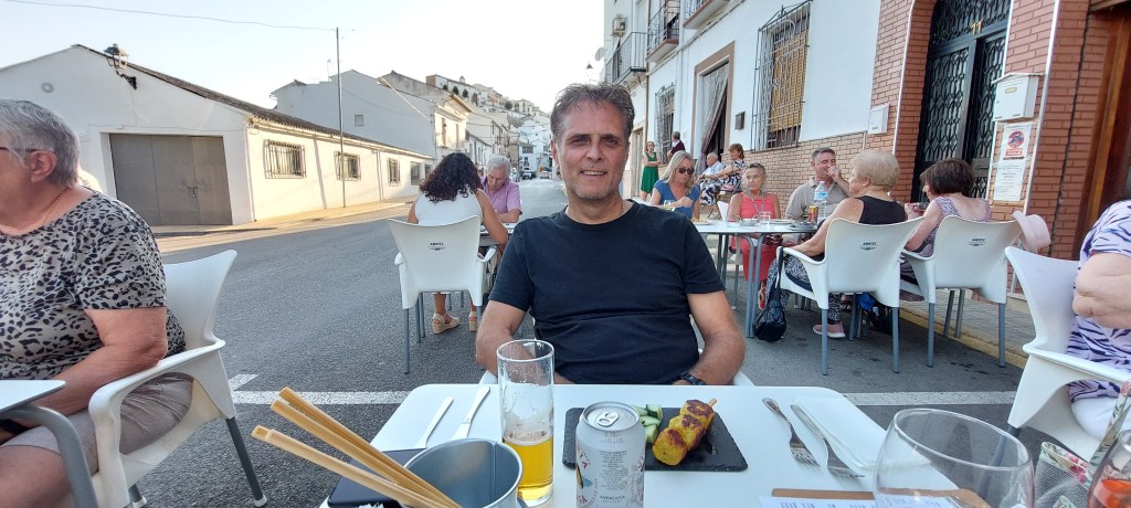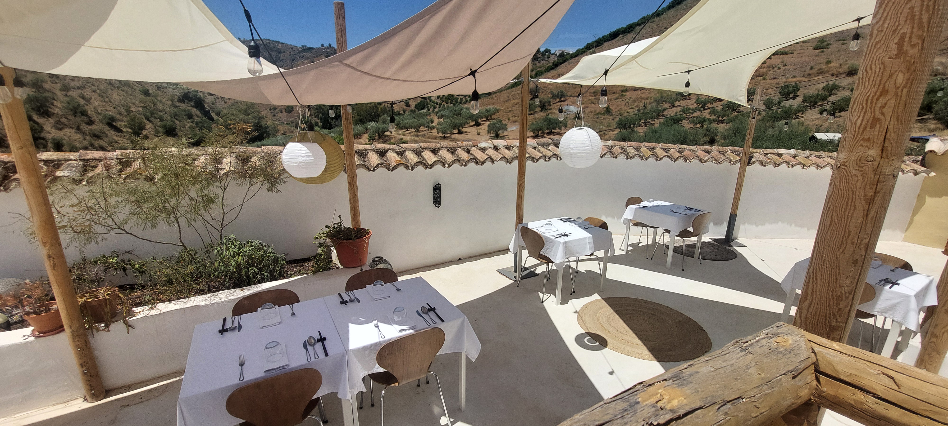 Inmiddels was het lunchtijd en we besloten door te rijden tot de stier bij Casabermeja en daar af te slaan de Axarquia in. Het heuvelachtige gebied daar is werkelijk prachtig, er is veel landbouw en in deze streek zie je nog veel diversiteit. Het wordt ook wel het Toscane van Spanje genoemd alleen wat droger. In Alfarnatejo zit een door ons zeer geliefd restaurant met een prachtige serre. Los Pirineos je kijkt vanaf je tafel daardoor uit op het schitterende landschap.