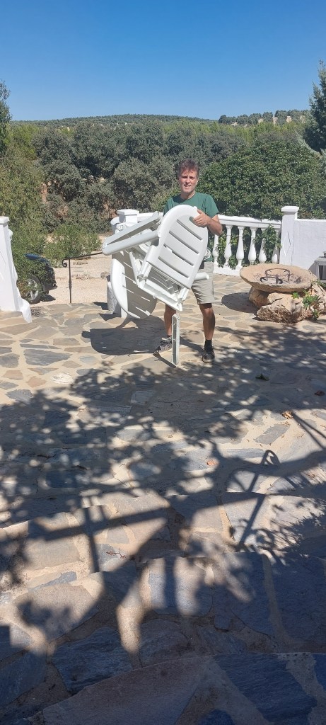 Onze klusjesman is nu ergens een huisje aan het opknappen en hij had een ander idee voor de overkapping. Waarom maak je die niet met vierkante palen ivm ronde palen zei hij, kom maar kijken bij het huisje waar we nu aan het werk zijn en stuurde me het adres. Het was net voor het dorp Fuente del Conde, de verharde weg af en omhoog de bergen in, bij het zien raakte ik al in paniek toen we erop reden nog meer, ik kan er niks aan doen maar ik vind dat zo eng. Hoe stoer ik ook ben vaak en vrijwel geen angsten lijk te hebben is dit iets waar ik wel echt bang voor ben.