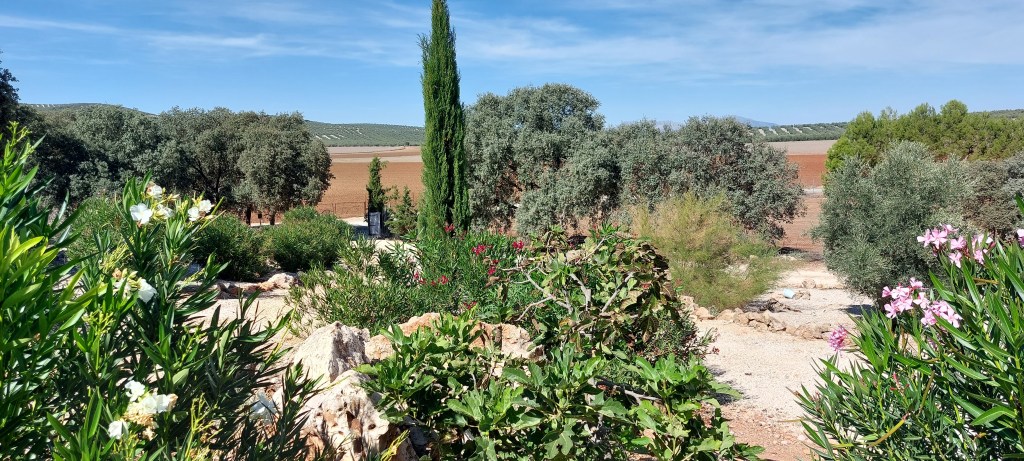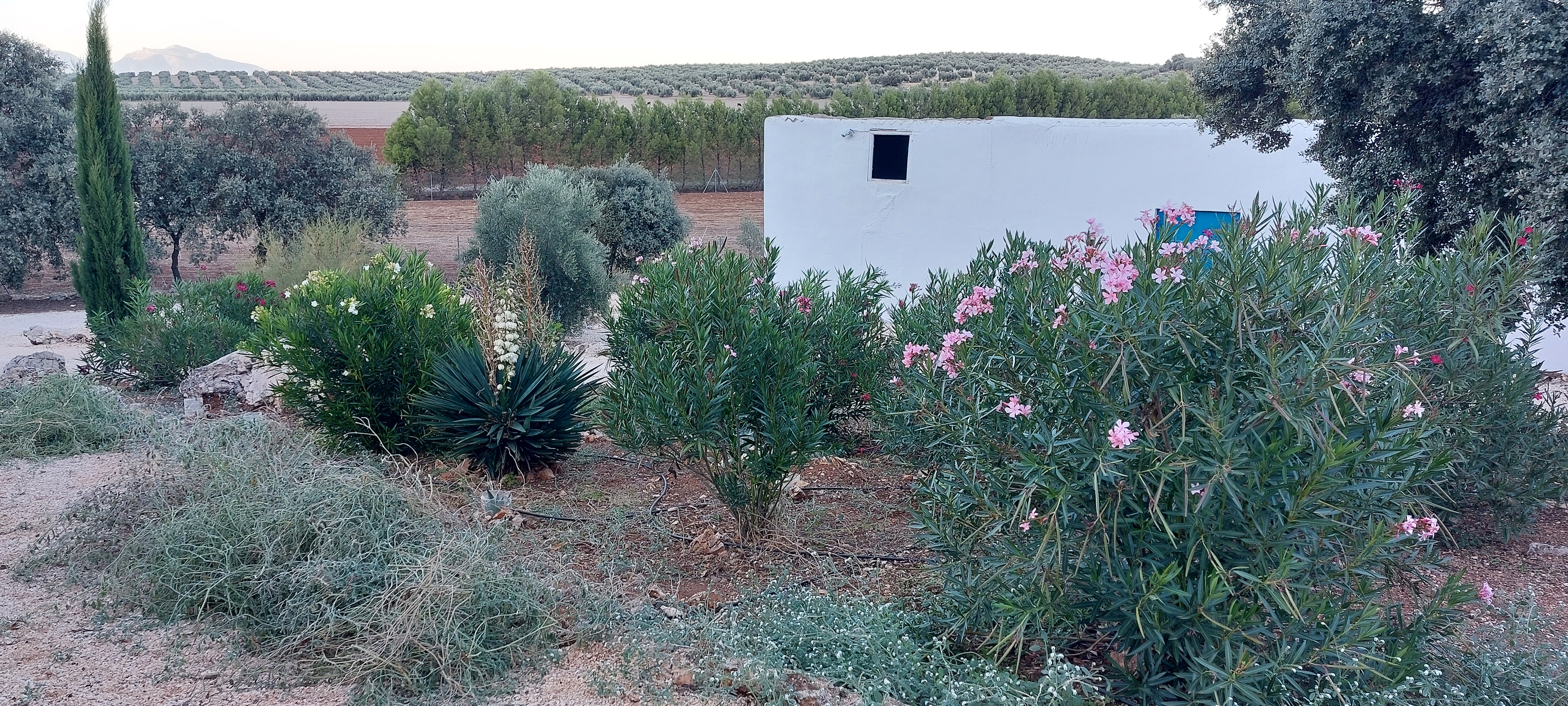 Verder zie je op de hacienda veel amandel bomen, vijgen bomen en dennenbomen. In onze tuin staan ook veel oleanders, niet alleen omdat ze mooi zijn maar ook omdat ze weinig water nodig hebben.