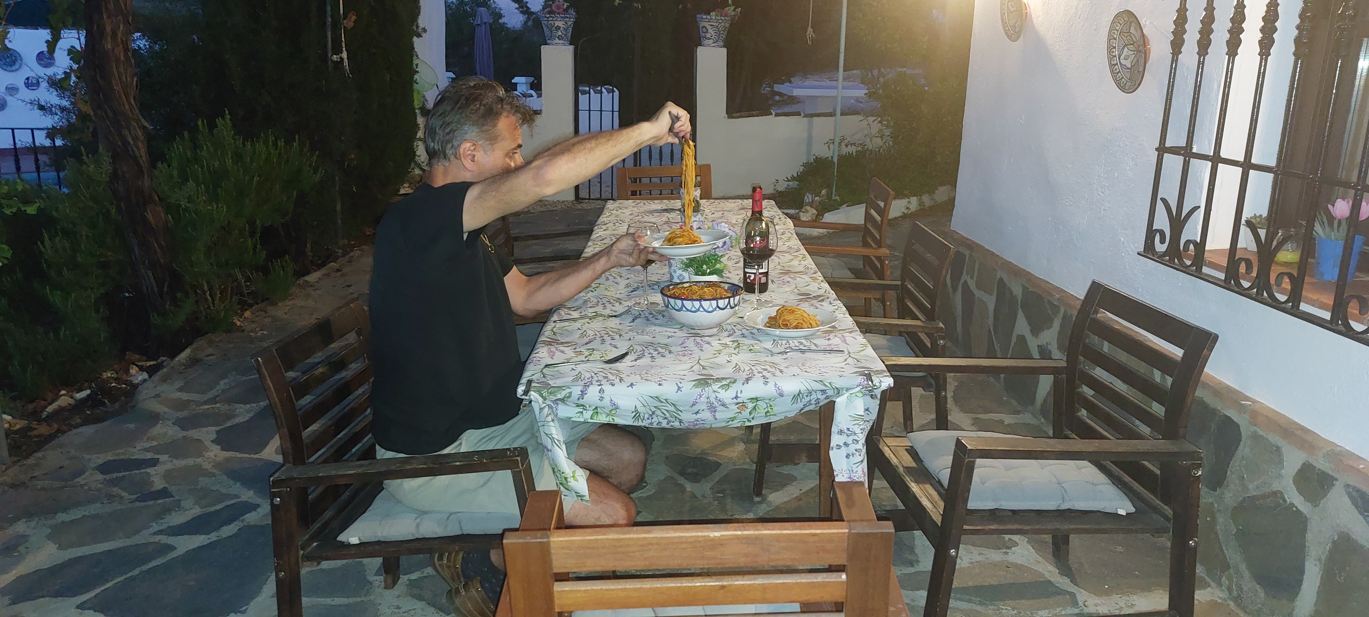 We hadden vandaag geen zin om erop uit te gaan. Lesley had spaghetti gemaakt en daar zaten we lekker van te smullen en te genieten van het mooie uitzicht vanaf ons terras. Wat een bofkonten zijn we toch.