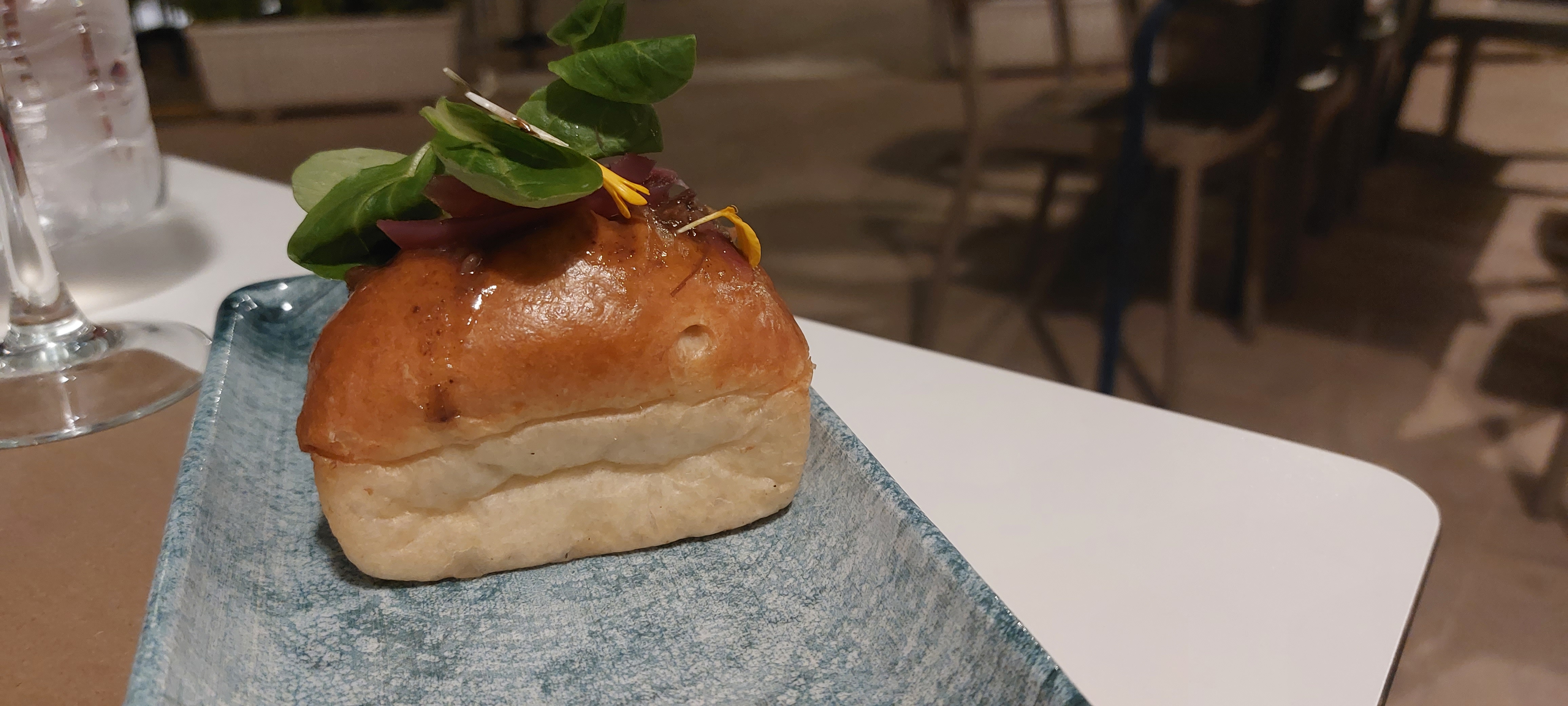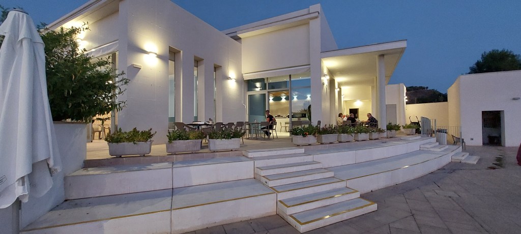 Het gebouw is modern en buiten stonden de tafeltjes gedekt. Ik had voor de zekerheid gebeld om te reserveren. Alle tafels die gedekt stonden waren bezet maar ik gok dat ze nog wel een voorraadje hebben staan om wat bij te schuiven, het terras is immers groot genoeg.