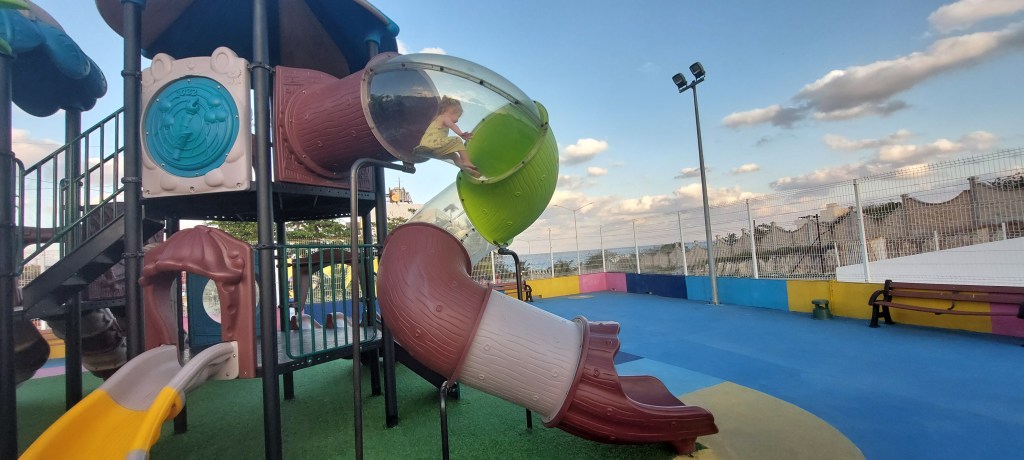 Fallon was ondertussen wakker en was te vinden bij de ijswinkel, daarna reden we weer met z’n alle naar de speeltuin die een kilometer hier vandaan ligt en het was weer dolle pret. Dikke tranen toen ze weer weg moest na een uurtje spelen.