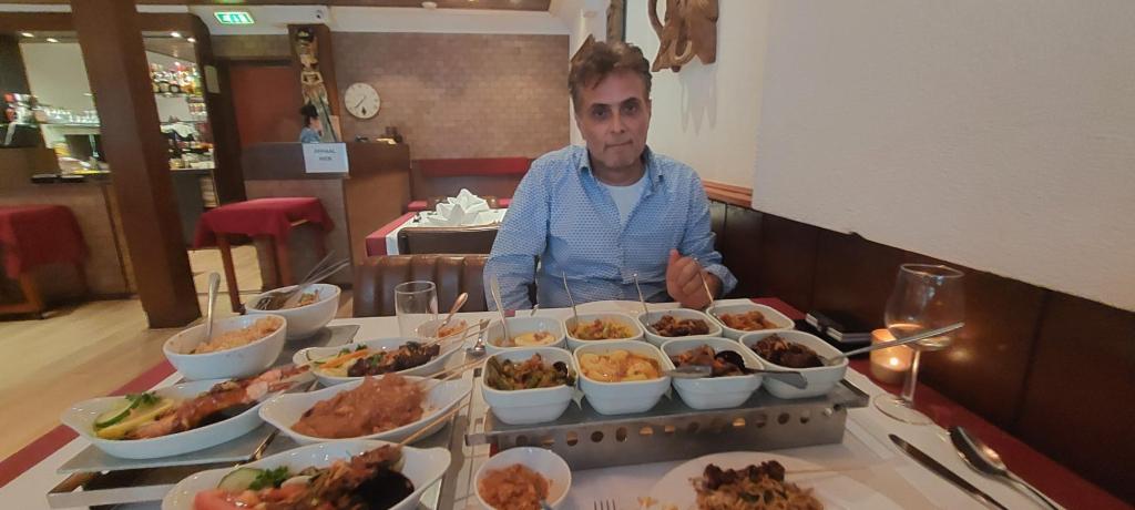 Dan maar saampjes vieren met zijn lievelings eten. Heerlijk Indonesisch, allemaal schaaltjes met zalige gerechtjes.