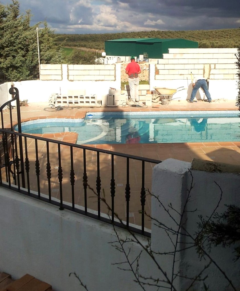 Achter ons huis in Spanje staat een groene schuur, dat was al toen wij het huis kochten 12 jaar geleden. Er omheen lag veel troep en dat zagen wij vanaf ons terras en daar stoorden we ons aan, daarom hadden wij besloten een muur om ons zwembad heen te zetten zodat we daar geen zicht meer op hadden en alleen een topje van het dak zagen.