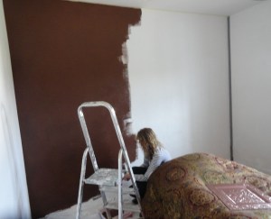 Doménique begon aan de muur in de slaapkamer, ik wilde graag 1 wandje een andere kleur hebben om zo een warme sfeer in de slaapkamer te creëren, de kleur Spanish Brown had ik uitgekozen bij het fantastische verf winkeltje “De mooiste muren” in Haarlem, hoe toepasselijk deze naam. Wat alleen een beetje jammer was dat we net niet genoeg verf hadden aan 1 liter, dus ik moet nog een potje bijkopen.