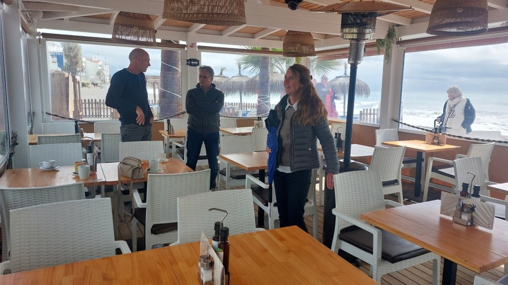 Vroeg in de morgen scheen de zon, zal het vandaag dan echt droog blijven dachten we? We stapten om 10 uur in de auto om op bezoek te gaan bij Jolanda en Bob die wonen in de bergen bij Torrox. Men zegt het beste klimaat van Spanje daar te hebben. Nou vandaag niet hoor, onderweg er naar toe begonnen de dikke regenbuien al, de wissers van de auto stonden op het hoogste standje. Je moest wel langzaam rijden want er waren flinke plassen op de weg. Daardoor kwamen we pas om half 12 in Nerja aan waar we afgesproken hadden. We zouden eerst naar de rommelmarkt gaan, die is er natuurlijk niet in de regen, daarom maar naar strand tentje Las Palmeras gereden tussen Nerja en Torrox in om een bakkie te drinken.