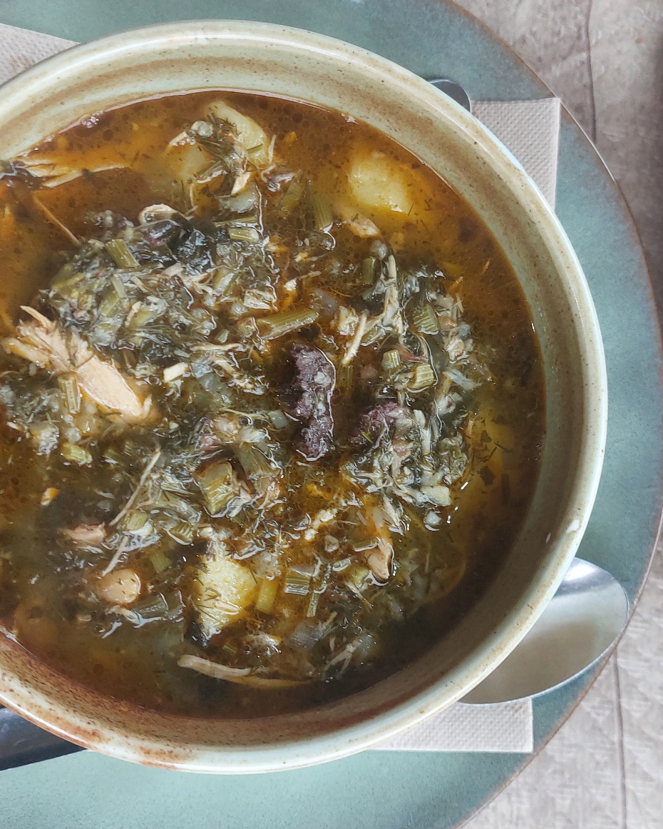 Vooraf deelde Les en ik een heerlijk plattelands soepje, met aardappelen, kikkererwten, veel groenten, kruiden en kip erin, daarbij een zalig gebakken broodje, waar ze ook beroemd om zijn. Niemand gaat bijna weg uit dit restaurant zonder er zelf ook 1 mee te nemen voor thuis.
