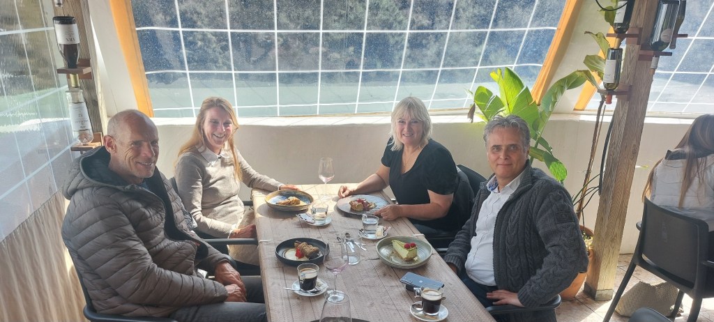 Als hoofd gerecht nam ik de veilige runder wangetjes en de rest ging de uitdaging aan, Lesley nam de hert en Jolanda en Bob de wildzwijn met chocolade saus. Iedereen zat te smullen. Na even gewacht te hebben bestelden we ook nog een huisgemaakt toetje. Plofvol zaten we allemaal, wat een super restaurant is dit zeg. Inmiddels was het weer droog en maakten we om onze magen wat de kalmeren nog een leuke wandeling.