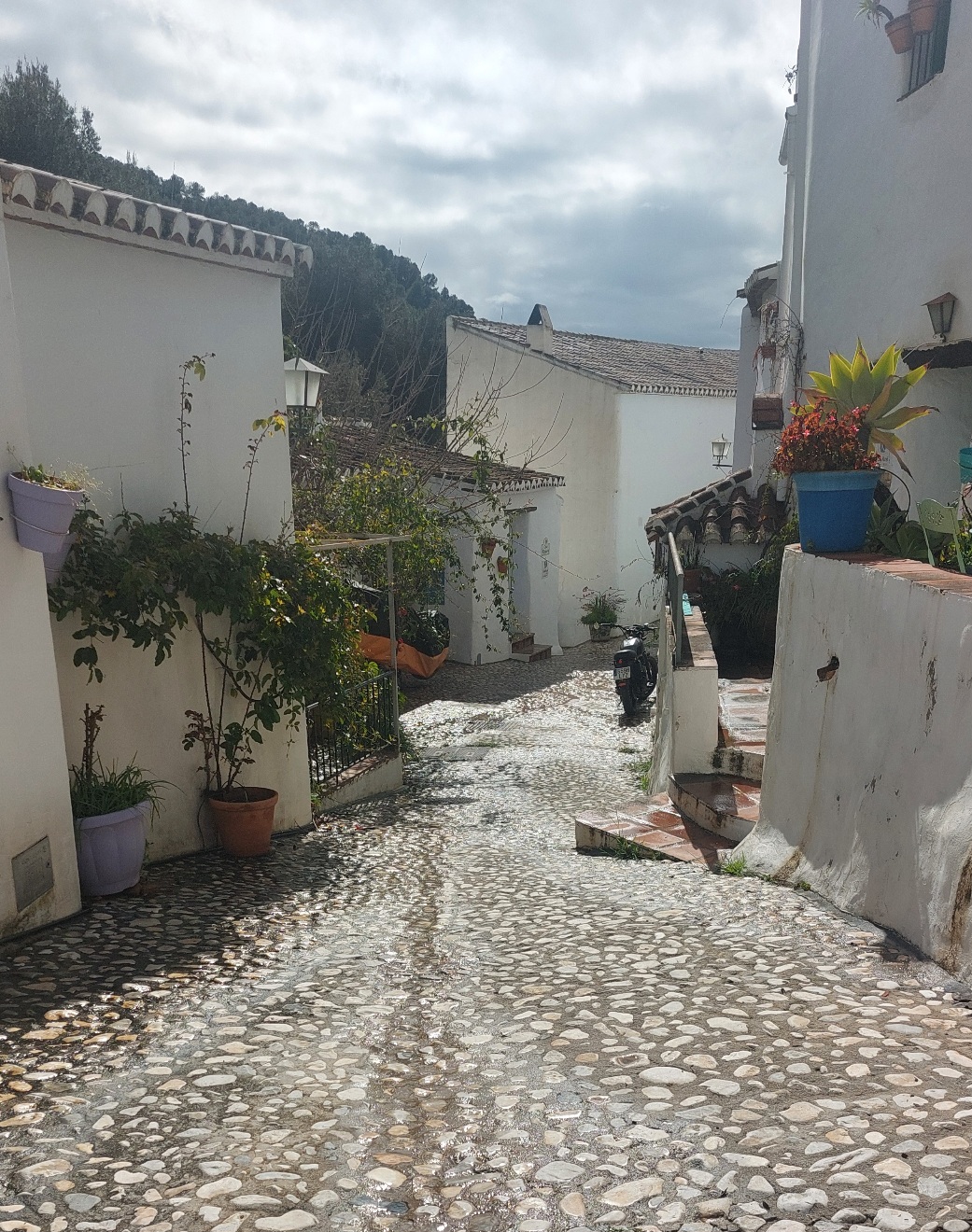 Vandaag reden we met de auto naar de lost Village Acebuchal. Een piep klein dorpje achter Frigiliana. We gingen met 1 auto en de stoere politie vrouw Jolanda zat achter het stuur. Haar vertrouwde ik volledig, ze is bekend met dit soort weggetjes en draait haar hand er niet voor om, ik ben een echte bangepoepert op dit soort weggetjes en ik was ook blij dat we er waren.