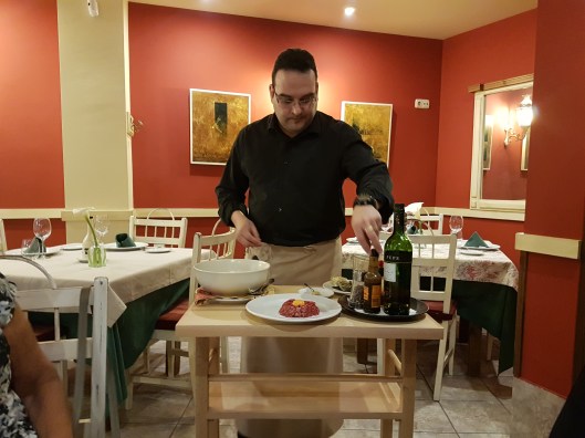 Maar ook chique eten bij Flati in Loja. Ik had de tartaar besteld en dit werd ouderwets aan tafel klaar gemaakt. Daar houden wij van als oud hotelschool leerlingen.