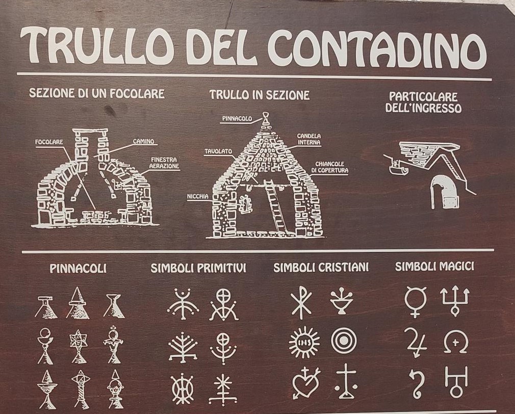 Er staan zeker 1500 trulli uit de 14de tot de 20ste eeuw in het dorpje Alberobello en daarom is dit dorpje het walhalla van de trullo en een must see plek. De daken van de witte huisjes zijn veelal versierd met symbolen, dit om zich te onderscheiden en als verwijzing naar de bouwer of bewoner van het huis en misschien ook wel om het kwaad buiten te houden.