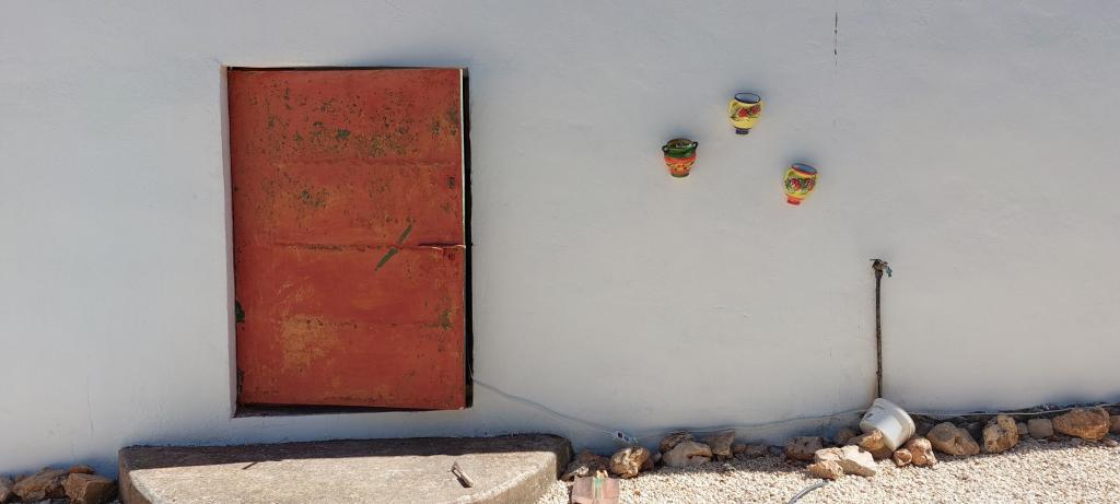 De zijdeur van de studio, het kozijn en de potjes zijn nu blauw.