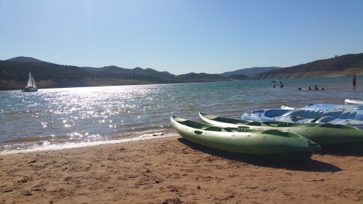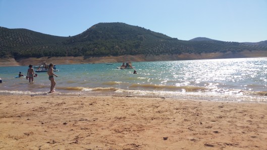We besloten nog wat leuks te gaan doen, de tijd vliegt immers en Elvira gaat morgen alweer naar huis. We gingen naar het mooie witte dorpje Iznajar (slechts 10 minuten van ons huis). De temperatuur was inmiddels flink opgelopen, moesten we afgelopen dagen af en toe nog een vestje aan door de wind, nu was weer zalig en het azuur blauwe meer nodigde ons uit om een lekkere duik te nemen. Je kan een strandstoel huren maar we wilden ouderwets het zand voelen, dus we ploften onze handdoek vlakbij het begin van het meer neer. Wat een heerlijk puur plekje, geen toeristen, op een verwaalde Engelsman na, en geen grote drukte.
